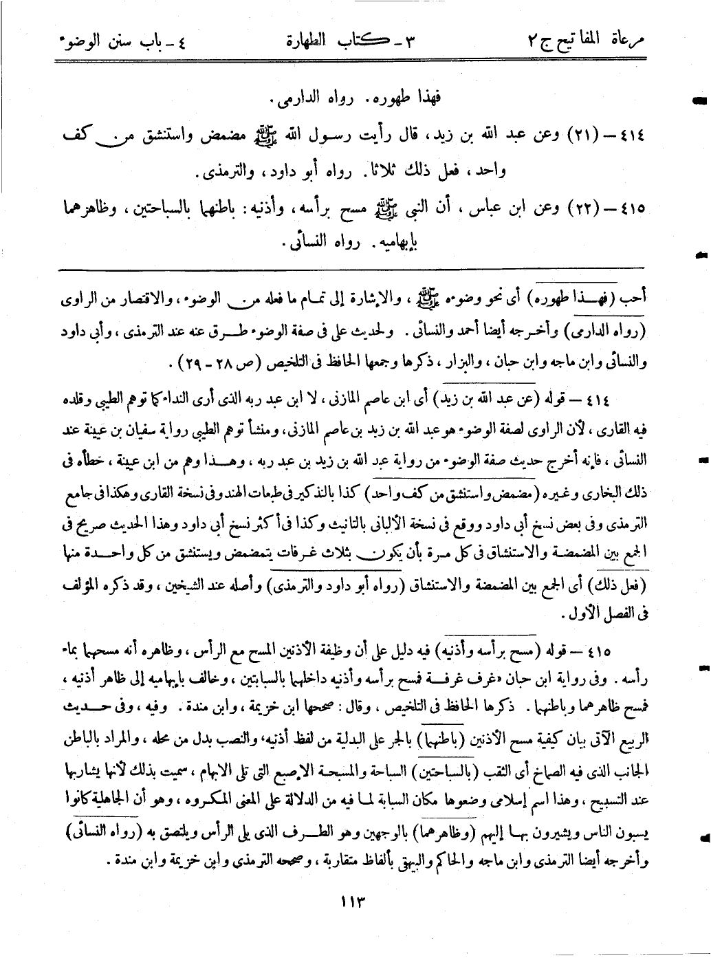 415- (22) وعن ابن عباس، ((أن النبي - صلى الله عليه وسلم - مسح برأسه، وأذنيه، باطنهما بالسباحتين، وظاهرهما بإبهاميه)) . رواه النسائي.