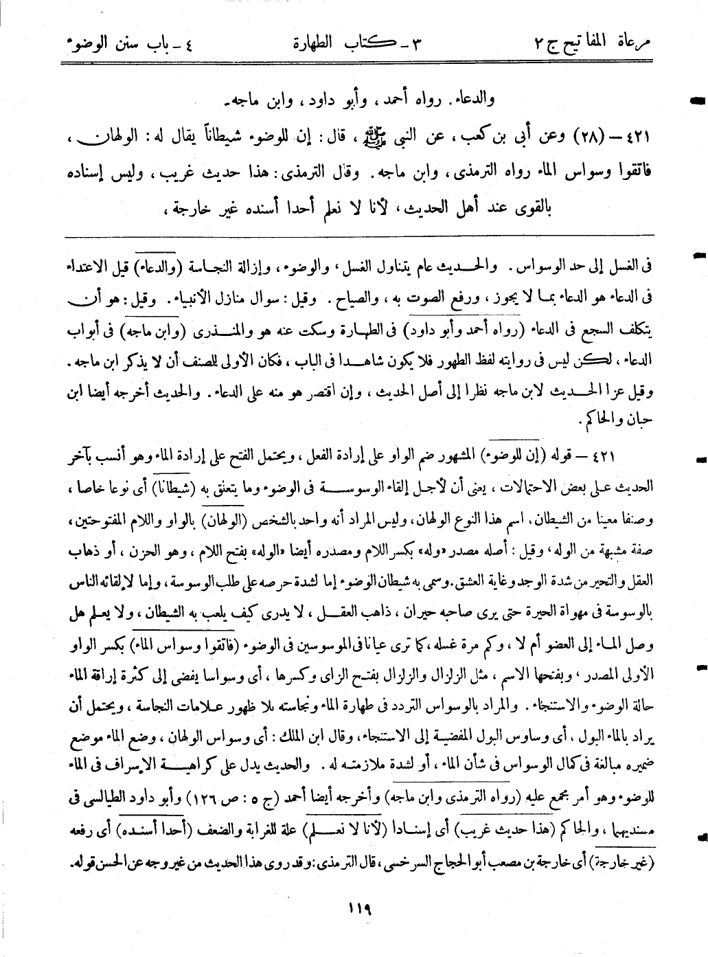 421- (28) وعن أبي بن كعب، عن النبي - صلى الله عليه وسلم -، قال: ((إن للوضوء شيطاناً يقال له: الولهان، فاتقوا وسواس الماء)) . رواه الترمذي، وابن ماجه. وقال الترمذي: هذا حديثٌ غريبٌ، وليس إسناده بالقوى عند أهل الحديث، لأنا لا نعلم أحداً أسنده غير خارجة،
