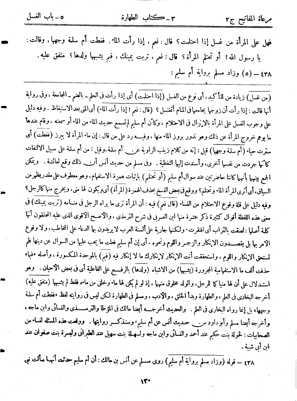 (من غسل) زيادة من للتأكيد، أي: نوع من الغسل (إذا احتلمت) أي: إذا رأت في الحلم – بالضم – المجامعة، وفي رواية أنها قالت: إذا رأت أن زوجها يجامعها في المنام أتغتسل؟ (قال: نعم! إذا رأت الماء) أي: المنى بعد الاستيقاظ. وفيه دليل على وجوب الغسل على المرأة بالإنزال في الاحتلام، وكأن أم سليم لم تسمع حديث الماء من الماء أو سمعته، وقام عندها مايوهم خروج المرأة عن ذلك وهو ندور بروز الماء منها، وفيه رد على من قال: إن ماء المرأة لا يبرز. (فغطت) أي: سترت حياءً (أم سلمة وجهها) قيل: إنه من كلام زينب الراوية عن أم سلمة، وقيل: من أم سلمة على سبيل الالتفات كأنها جردت من نفسها أخرى، وأسندت إليها التغطية. وفي مسلم من حديث أنس أن ذلك وقع لعائشة. ويمكن الجمع بينهما بأنهما كانتا حاضرتين عند سؤال أم سليم. (أو تحتلم) بإثبات همزة الاستفهام، وهو معطوف على مقدر يظهر من السياق، أي: أترى المرأة الماء وتحتلم؟ ووقع في بعض النسخ بحذف الهمزة. (المرأة) أي: ويكون لها مني، ويخرج منها كالرجل؟ وفيه دليل على قلة وقوع الاحتلام من النساء، (قال: نعم) فيه: أن المرأة ترى ما يراه الرجل في منامه (تربت يمينك) في معنى هذه اللفظة أقوال كثيرة، ذكر عشرة منها ابن العربي في شرح الترمذي، والأصح الأقوى الذي عليه المحققون أنها كلمة أصلها: لصقت بالتراب أي: افتقرت، ولكنها جارية على ألسنة العرب لا يريدون بها الدعاء على المخاطب، ولا وقوع الأمر بها بل يقصدون الإنكار والزجر واللوم ونحوه، أي: إن أم سليم فعلت ما يجب عليها من السؤال عن دينها فلم تستحق الإنكار واللوم، واستحققت أنت الإنكار لإنكارك ما لا إنكار فيه. (فبم) بالموحدة المكسورة، وأصله "فبما" حذفت ألف ما الإستفهامية المجرورة. (يشبهها) من الأشباه (ولدها) بالرفع على الفاعلية أي: في بعض الأحيان. وهو استدلال على أن لها منيا كما للرجل، والولد مخلوق منهما، إذ لو لم يكن لها ماء، وخلق من ماءه فقط لم يشبهها. (متفق عليه) أخرجه البخاري في العلم، والطهارة وبدأ الخلق، والأدب، ومسلم في الطهارة لكن ليس في روايته لفظ "فغطت أم سلمة وجهها" بل إنما رواه البخاري في العلم. والحديث أخرجه أيضاً مالك في المؤطا والترمذي والنسائي وابن ماجه، وأخرجه أيضاً مسلم وأبوداود من حديث أنس عن أم سليم، وسنذكر روايتها. ووقعت هذه المسألة لنساء من الصحابيات: لخولة بنت حكيم عند أحمد والنسائي وابن ماجه، ولسهلة بنت سهيل عند الطبراني، ولبسرة بنت صفوان عند ابن أبي شيبه.
