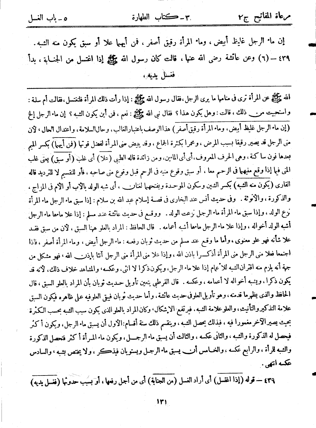 439- (6) وعن عائشة رضي الله عنها، قالت: ((كان رسول الله - صلى الله عليه وسلم - إذا اغتسل من الجنابة، بدأ فغسل يديه،