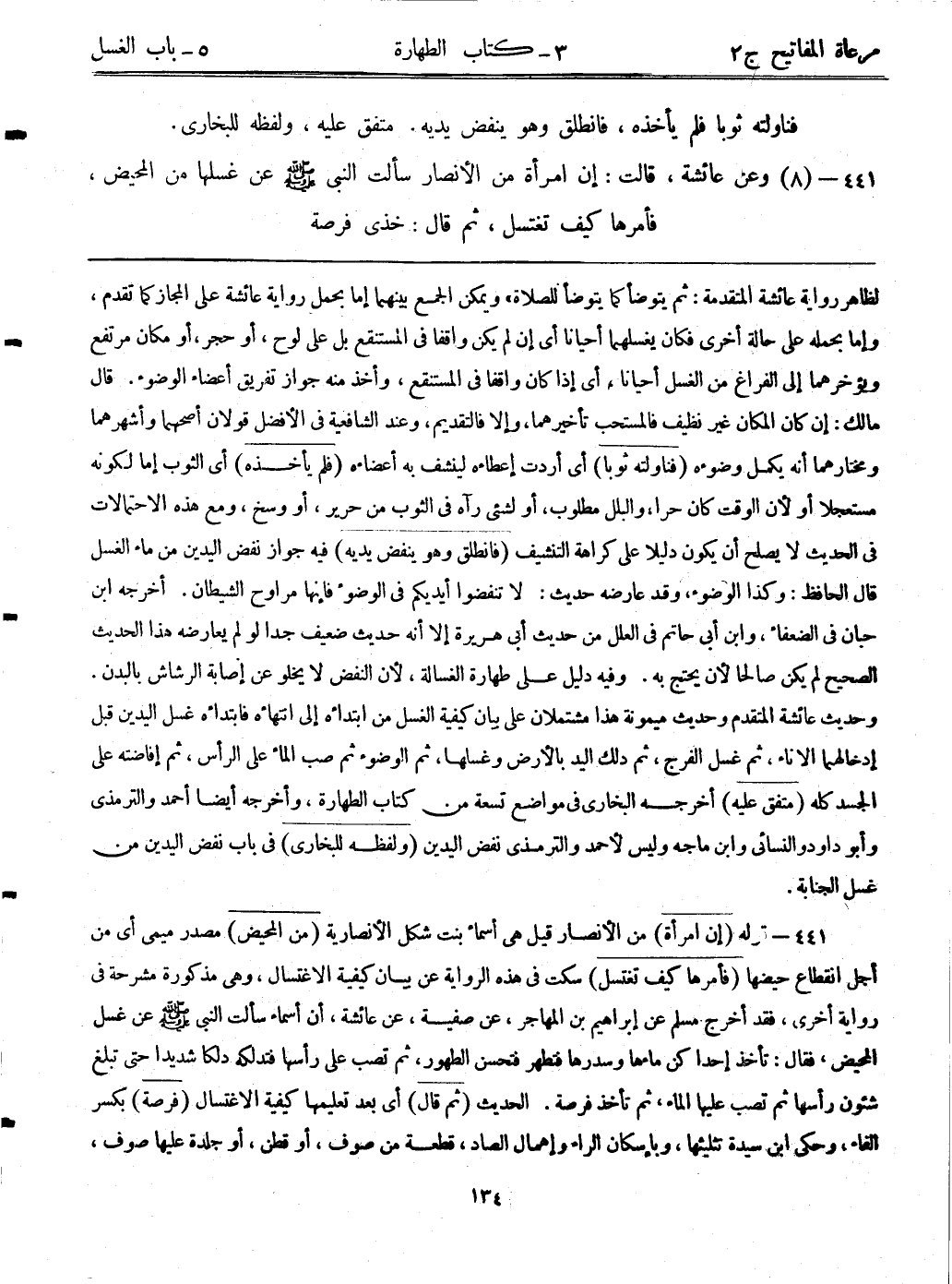 441- (8) وعن عائشة، قالت: ((إن امرأة من الأنصار سألت النبي - صلى الله عليه وسلم - عن غسلها من المحيض، فأمرها كيف تغتسل، ثم قال: خذي فرصة