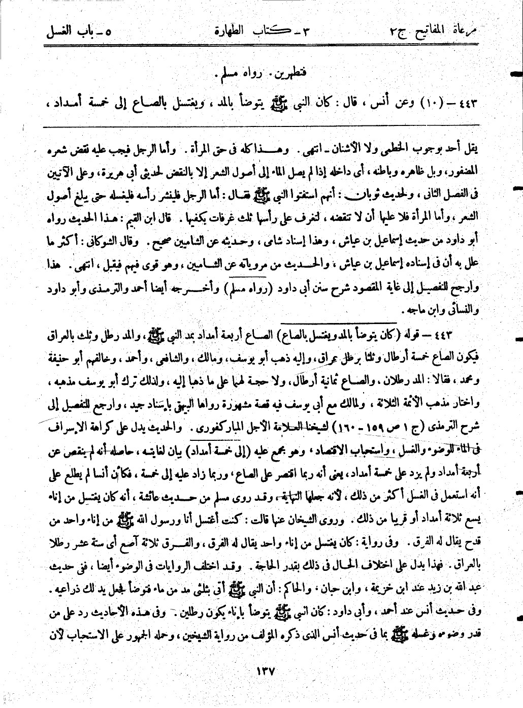 443- (10) وعن أنس قال: ((كان النبي - صلى الله عليه وسلم - يتوضأ بالمد، ويغتسل بالصاع إلى خمسة أمداد)) .