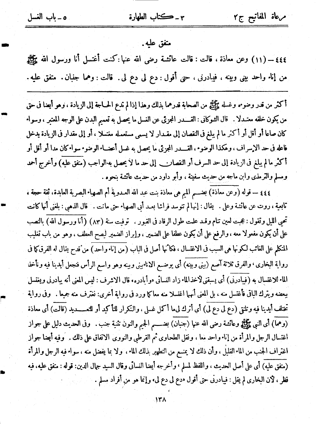 444- قوله: (وعن معاذة) بضم الميم هي معاذة بنت عبد الله العدوية أم الصهباء البصرية العابدة، ثقة حجة، تابعية، روت عن عائشة وعلي. يقال: إنها لم تتوسد فراشاً بعد أبي الصهباء حتى ماتت. قال الذهبي: بلغني أنها كانت تحيي الليل وتقول: عجبت لعين تنام وقد علمت طول الرقاد في القبور. توفيت سنة (83) . (أنا ورسول الله) بالنصب على أن يكون مفعولاً معه، والرفع على أن يكون عطفاً على الضمير، وإبراز الضمير ليصح العطف، وهو من باب تغليب المتكلم على الغائب لكونها هي السبب في الاغتسال، فكأنها أصل في الباب. (من إناء واحد) من قدح يقال له الفرق، كما في رواية البخاري، والفرق ثلاثة آصع (بيني وبينه) أي: يوضع الإناء بيني وبينه وهو واسع الرأس، فنجعل أيدينا ونأخذ الماء للاغتسال به. (فيبادرني) أي: يسبقني لأخذ الماء زاد النسائي "وأبادره" قال الأشرف: ليس المعنى أنه يبادرني ويغتسل ببعضه ويترك الباقي فأغتسل منه، بل المعنى أنهما اغتسلا منه معاً كما ورد في رواية أخرى: "نغترف منه جميعاً". وفي رواية: "تختلف أيدينا فيه وتلتقي". (دع لي دع لي) أي: أترك لي ما أكمل غسلي، والتكرار للتأكيد أو للتعديد. (قالت) أي: معاذة. (وهما) أي: النبي - صلى الله عليه وسلم - وعائشة رضي الله عنها. (جنبان) بضم الجيم والنون تثنية جنب. وفي الحديث دليل على جواز اغتسال الرجل والمرأة من إناء واحد معاً، ونقل الطحاوي ثم القرطبي والنووي الاتفاق على ذلك. وفيه أيضاً جواز اغتراف الجنب من الماء القليل، وأن ذلك لا يمنع من التطهير بذلك الماء، ولا بما يفضل منه، سواء فيه الرجل وامرأة. (متفق عليه) أي: على أصل الحديث، واللفظ لمسلم، وأخرجه أيضاً النسائي وقال السيد جمال الدين: قوله: متفق عليه، فيه نظر؛ لأن البخاري لم يقل: فيبادرني حتى أقول "دع لي دع لي" وإنما هو من أفراد مسلم.