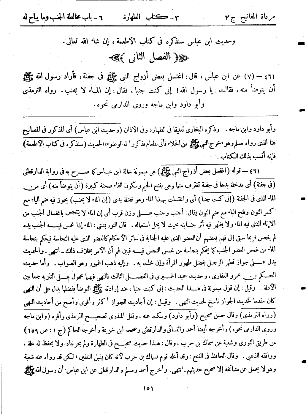 461- (7) عن ابن عباس، قال: ((اغتسل بعض أزواج النبي - صلى الله عليه وسلم - في جفنة، فأراد رسول الله - صلى الله عليه وسلم - أن يتوضأ منه، فقالت: يا رسول الله - صلى الله عليه وسلم -! إني كنت جنباً، فقال: إن الماء لا يجنب)) رواه الترمذي وأبوداود وابن ماجه وروى الدارمي نحوه.