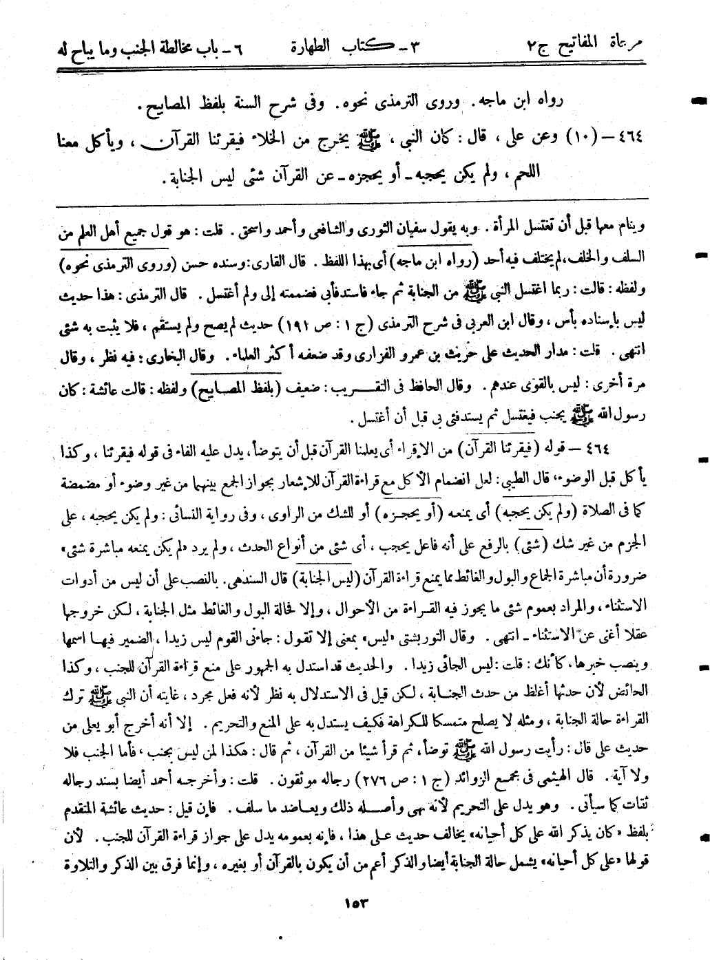 464- (10) وعن علي، قال: ((كان النبي - صلى الله عليه وسلم -، يخرج من الخلاء فيقرئنا القرآن، ويأكل معنا اللحم، ولم يكن يحجبه – أو يحجزه – عن القرآن شئ ليس الجنابة)) .