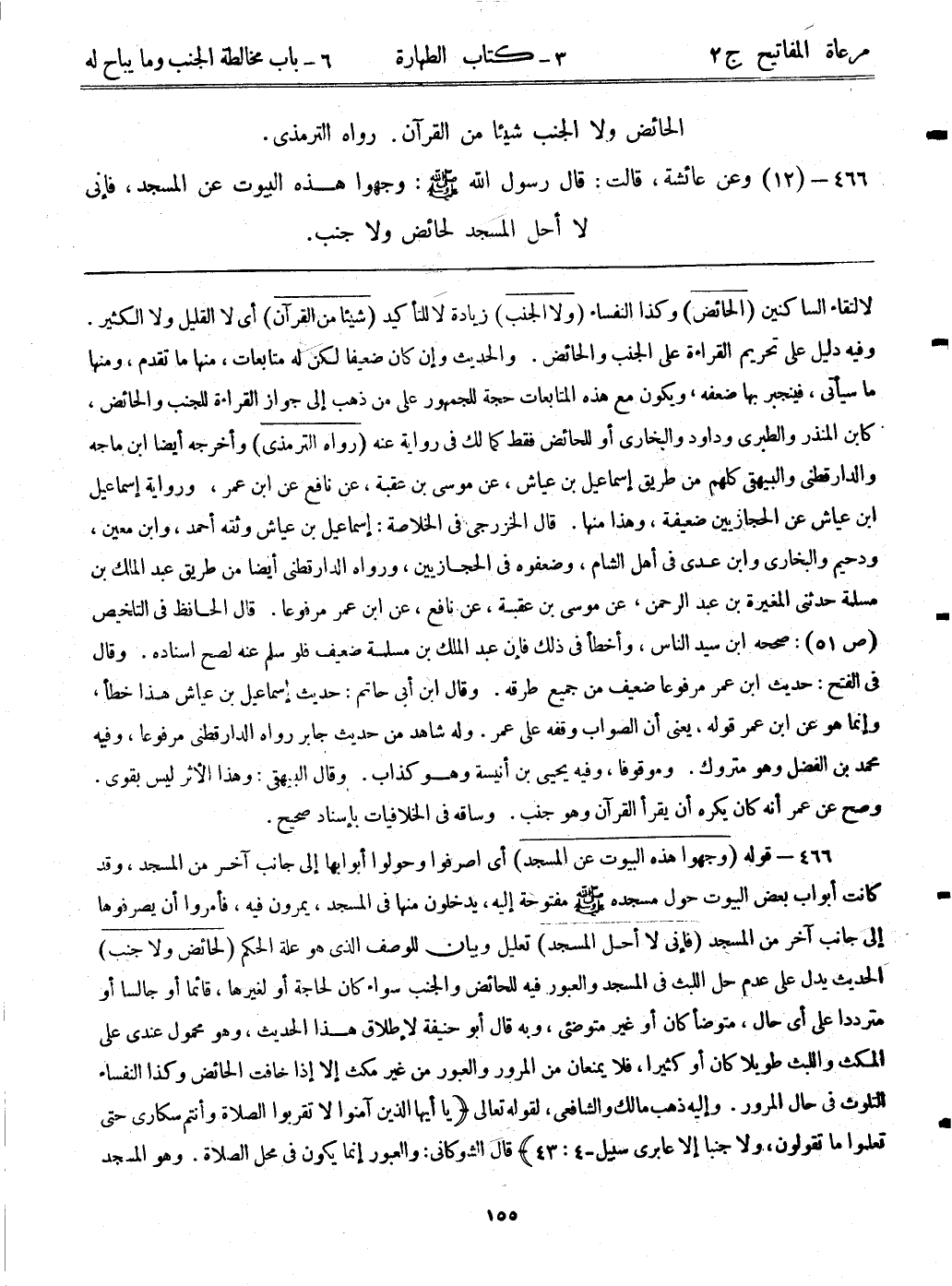 466- (12) وعن عائشة، قالت: قال رسول الله - صلى الله عليه وسلم -: ((وجهوا هذه البيوت عن المسجد، فإني لا أحل المسجد لحائض ولا جنب)) .