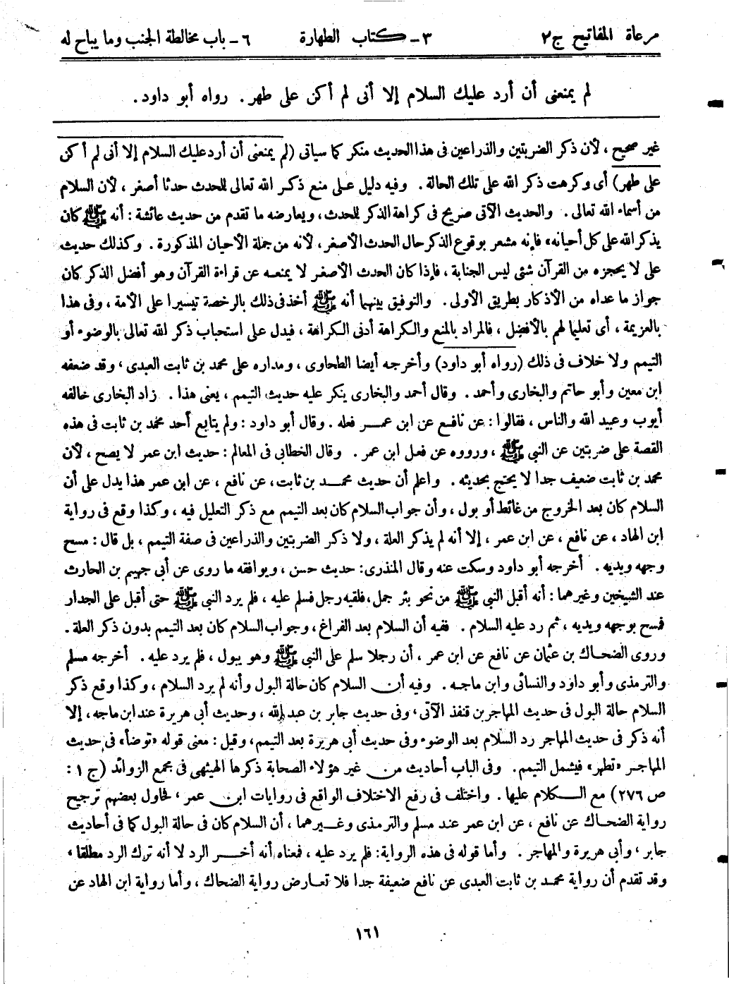 غير صحيح، لأن ذكر الضربتين والذراعين في هذا الحديث منكر كما سيأتي. (لم يمنعني أن أرد عليك السلام إلا أني لم أكن على طهر) أي: وكرهت ذكر الله على تلك الحالة. وفيه دليل على منع ذكر الله للمحدث حدثاً أصغر، لأن السلام من أسماء الله تعالى. والحديث الآتي صريح في كراهة الذكر للمحدث، ويعارضه ما تقدم من حديث عائشة: "أنه - صلى الله عليه وسلم - كان يذكر الله على كل أحيانه"، فإنه مشعر بوقوع الذكر حال الحدث الأصغر، لأنه من جملة الأحيان المذكورة. وكذلك حديث علي لا يحجزه من القرآن شيء ليس الجنابة، فإذا كان الحدث الأصغر لا يمنعه عن قراءة القرآن وهو أفضل الذكر كان جواز ما عداه من الأذكار بطريق الأولى. والتوفيق بينهما، أنه - صلى الله عليه وسلم - أخذ في ذلك بالرخصة تيسيراً على الأمة، وفي هذا العزيمة، أي: تعليماً لهم بالأفضل، فالمراد بالمنع والكراهة أدنى الكراهة، فيدل على استحباب ذكر الله تعالى بالوضوء أو التيمم ولا خلاف في ذلك. (رواه أبوداود) وأخرجه أيضاً الطحاوى، ومداره على محمد بن ثابت العبدي، وقد ضعفه ابن معين وأبوحاتم والبخاري وأحمد. وقال أحمد والبخاري ينكر عليه حديث التيمم، يعني هذا. زاد البخاري خالفه أيوب وعبيد الله والناس، فقالوا: عن نافع عن ابن عمر فعله. وقال أبوداود: ولم يتابع أحد محمد بن ثابت في هذ القصة على ضربتين عن النبي - صلى الله عليه وسلم -، ورووه عن فعل ابن عمر. وقال الخطابي في المعالم: حديث ابن عمر لا يصح، لأن محمد بن ثابت ضعيف جداً لا يحتج بحديثه. واعلم أن حديث محمد بن ثابت، عن نافع، عن ابن عمر هذا يدل على أن السلام كان بعد الخروج من غائط أو بول، وأن جواب السلام كان بعد التيمم مع ذكر التعليل فيه، وكذا وقع في رواية ابن الهاد، عن نافع، عن ابن عمر، إلا أنه لم يذكر العلة، ولا ذكر الضربتين والذراعين في صفة التيمم، بل قال: مسح وجهه ويديه. أخرجه أبوداود وسكت عنه وقال المنذري: حديث حسن، ويوافقه ما روى عن أبي جهيم بن الحارث عند الشيخين وغيرهما: أنه أقبل النبي - صلى الله عليه وسلم - من نحو بئر جمل، فلقيه رجل فسلم عليه، فلم يرد النبي - صلى الله عليه وسلم - حتى أقبل على الجدار فمسح بوجهه ويديه، ثم رد عليه السلام. ففيه أن السلام بعد الفراغ، وجواب السلام كان بعد التيمم بدون ذكر العلة. وروى الضحاك بن عثمان عن نافع عن ابن عمر، أن رجلاً سلم على النبي - صلى الله عليه وسلم - وهو يبول، فلم يرد عليه. أخرجه مسلم والترمذي وأبوداود والنسائي وابن ماجه. وفيه أن السلام كان حالة البول وأنه لم يرد السلام، وكذا وقع ذكر السلام حالة البول في حديث المهاجر بن قنفذ الآتي، وفي حديث جابر بن عبد الله، وحديث أبي هريرة عند ابن ماجه، إلا أنه ذكر في حديث المهاجر رد السلام بعد الوضوء وفي حديث أبي هريرة بعد التيمم، وقيل: معنى قوله: "توضأ" في حديث المهاجر "تطهر" فيشمل التيمم. وفي الباب أحاديث من غير هؤلاء الصحابة ذكرها الهيثمي في مجمع الزوائد (ج1:ص276) مع الكلام عليها. واختلف في رفع الاختلاف الواقع في روايات ابن عمر، فحاول بعضهم ترجيح رواية الضحاك عن نافع، عن ابن عمر عند مسلم والترمذي وغيرهما، أن السلام كان في حالة البول كما في أحاديث جابر، وأبي هريرة والمهاجر. وأما قوله: في هذه الرواية: فلم يرد عليه، فمعناه أنه أخر الرد لا أنه ترك الرد مطلقاً، وقد تقدم أن رواية محمد بن ثابت العبدي عن نافع ضعيفة جداً فلا تعارض رواية الضحاك، وأما رواية ابن الهاد عن