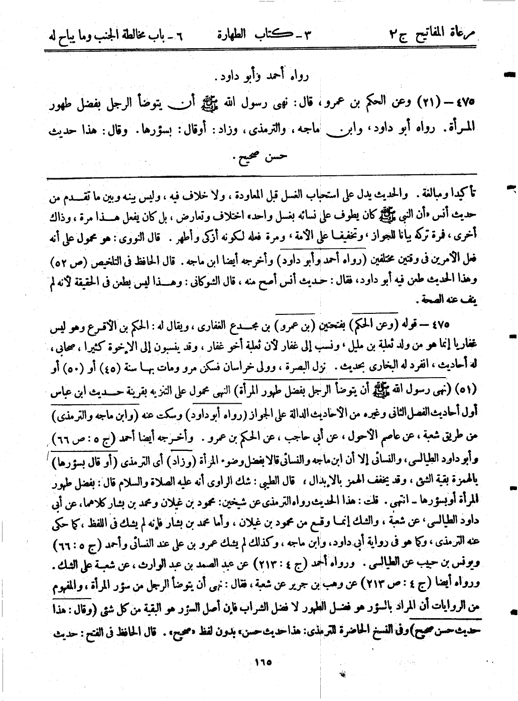 475- (21) وعن الحكم بن عمرو، قال: ((نهى رسول الله - صلى الله عليه وسلم - أن يتوضأ الرجل بفضل طهور المرأة)) . رواه أبوداود، وابن ماجه، والترمذي، وزاد: أو قال: بسؤرها. وقال: هذا حديث حسن صحيح.