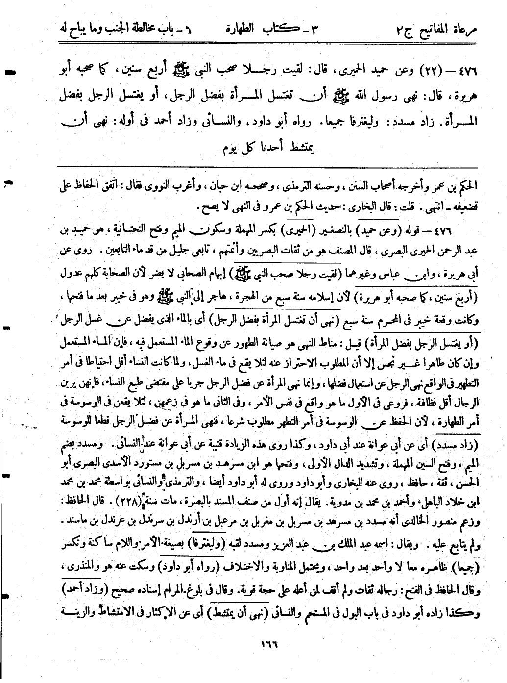 476- قوله: (وعن حميد) بالتصغير. (الحميري) بكسر المهملة وسكون الميم وفتح التحتانية، هو حميد بن عبد الرحمن الحميري البصري، قال المصنف هو من ثقات البصريين وأئمتهم، تابعي جليل من قدماء التابعين. روى عن أبي هريرة، وابن عباس وغيرهما. (لقيت رجلاً صحب النبي - صلى الله عليه وسلم -) إبهام الصحابي لا يضر لأن الصحابة كلهم عدول. (أربع سنين، كما صحبه أبوهريرة) لأن إسلامه سنة سبع من الهجرة، هاجر إلى النبي - صلى الله عليه وسلم - وهو في خيبر بعد مافتحها، وكانت وقعة خيبر في المحرم سنة سبع. (نهى أن تغتسل المرأة بفضل الرجل) أي: بالماء الذي يفضل عن غسل الرجل. (أو يغتسل الرجل بفضل المرأة) قيل: مناط النهى هو صيانة الطهور عن وقوع الماء المستعمل فيه، فإن الماء المستعمل وإن كان طاهراً غير نجس إلا أن المطلوب الاحتراز عنه لئلا يقع في ماء الغسل، ولما كانت النساء أقل احتياطاً في أمر التطهير في الواقع، نهى الرجل عن استعمال فضلها، وإنما نهى المرأة عن فضل الرجل جرياً على مقتضى طبع النساء، فإنهن يرين الرجال أقل نظافة، فروعى في الأول ما هو واقع في نفس الأمر، وفي الثاني ما هو في زعمهن، لئلا يقعن في الوسوسة في أمر الطهارة، لأن الحفظ عن الوسوسة في أمر التطهير مطلوب شرعاً، فنهى المرأة عن فضل الرجل قطعاً للوسوسة. (زاد مسدد) أي: عن أبي عوانة عند أبي داود، وكذا روى هذه الزيادة قتيبة عن أبي عوانة عند النسائي. ومسدد بضم الميم، وفتح السين المهملة، وتشديد الدال الأولى، وفتحها هو ابن مسرهد بن مسربل بن مستورد الأسدي البصري أبوالحسن، ثقة، حافظ، روى عنه البخاري وأبوداود وروى له أبوداود أيضاً، والترمذي والنسائي بواسطة محمد بن محمد ابن خلاد الباهلي، وأحمد بن محمد بن مدوية. يقال إنه أول من صنف المسند بالبصرة، مات سنة (228) . قال الحافظ: وزعم منصور الخالدي أنه مسدد بن مسرهد بن مسربل بن مغربل بن مرعبل بن أرندل بن سرندل بن عرندل بن ماسند. ولم يتابع عليه. ويقال: اسمه عبد الملك بن عبد العزيز ومسدد لقبه. (وليغترفا) بصيغة أمر واللام ساكنة وتكسر. (جميعاً) ظاهره معاً لا واحد بعد واحد، ويحتمل المناوبة والاختلاف. (رواه أبوداود) وسكت عنه هو والمنذري، وقال الحافظ في الفتح: رجاله ثقات ولم أقف لمن أعله على حجة قوية. وقال في بلوغ المرام إسناده صحيح. (وزاد أحمد) وكذا زاده أبوداود في باب البول في المستحم والنسائي. (نهى أن يمتشط) أي: عن الإكثار في الامتشاط والزينة