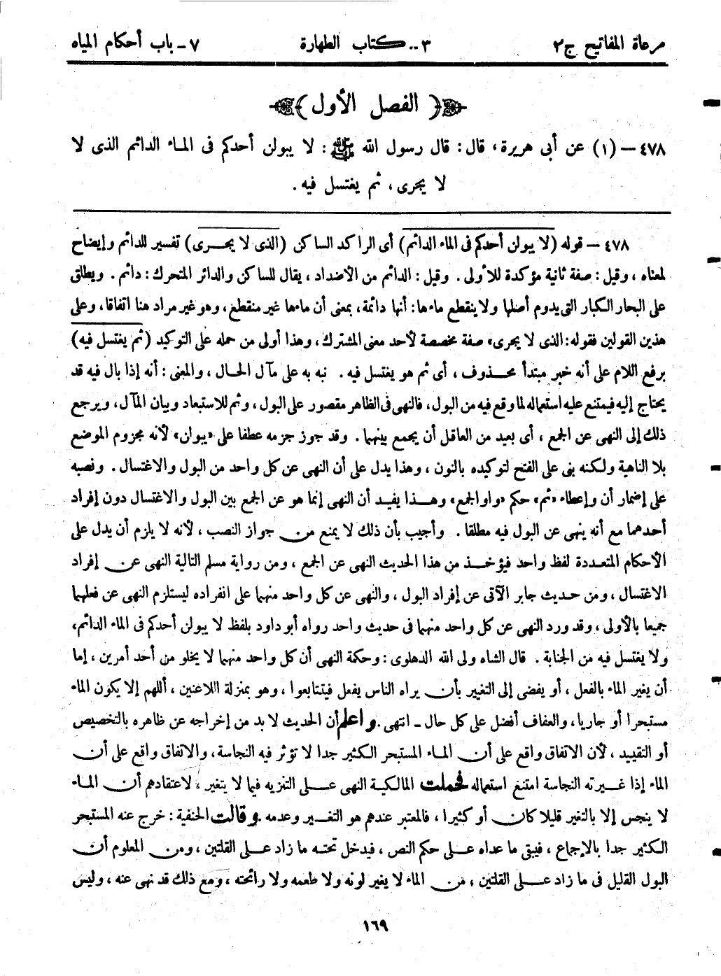 478- (1) عن أبي هريرة، قال: قال رسول الله - صلى الله عليه وسلم -: ((لا يبولن أحدكم في الماء الدائم الذي لا يجري، ثم يغتسل فيه)) .