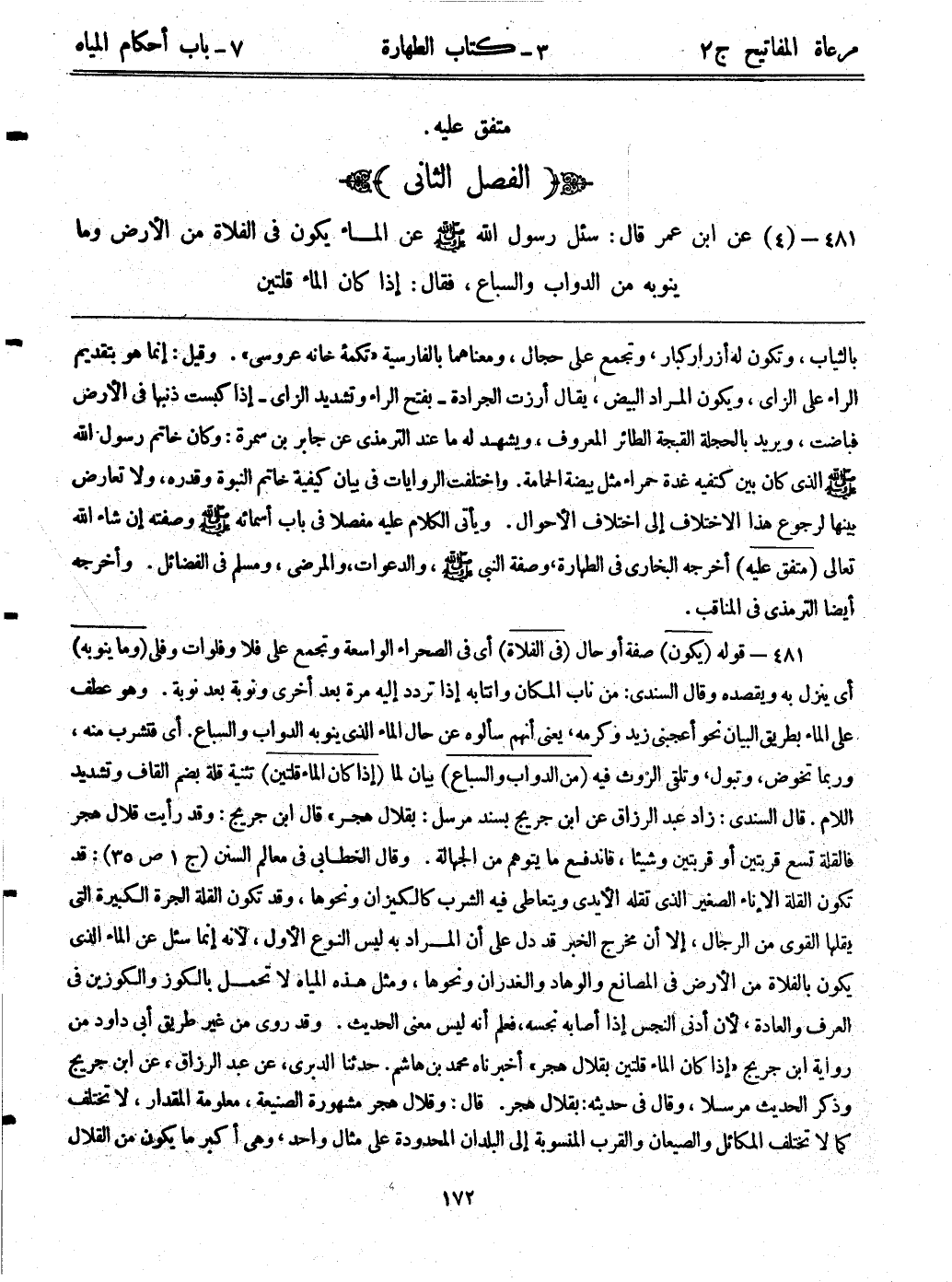 481- (4) عن ابن عمر قال: سئل رسول الله - صلى الله عليه وسلم - عن الماء يكون في الفلاة من الأرض وما ينوبه من الدواب والسباع، فقال: ((إذا كان الماء قلتين