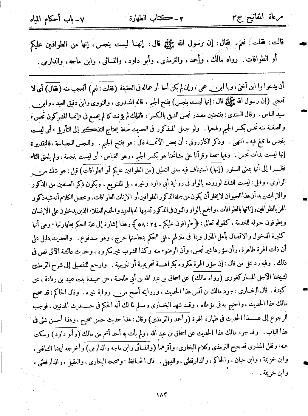 قالت: فقلت: نعم. فقال: إن رسول الله - صلى الله عليه وسلم - قال: ((إنها ليست بنجس إنها من الطوافين عليكم أو الطوافات)) . رواه مالك، وأحمد، والترمذي، وأبوداود، والنسائي، وابن ماجة، والدارمي.