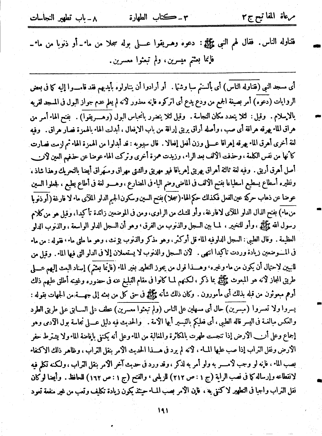 فتناوله الناس. فقال لهم النبي - صلى الله عليه وسلم -: ((دعوه وهريقوا على بوله سجلاً من ماء - أو ذنوباً من ماء - فإنما بعثتم ميسرين، ولم تبعثوا معسرين)) .