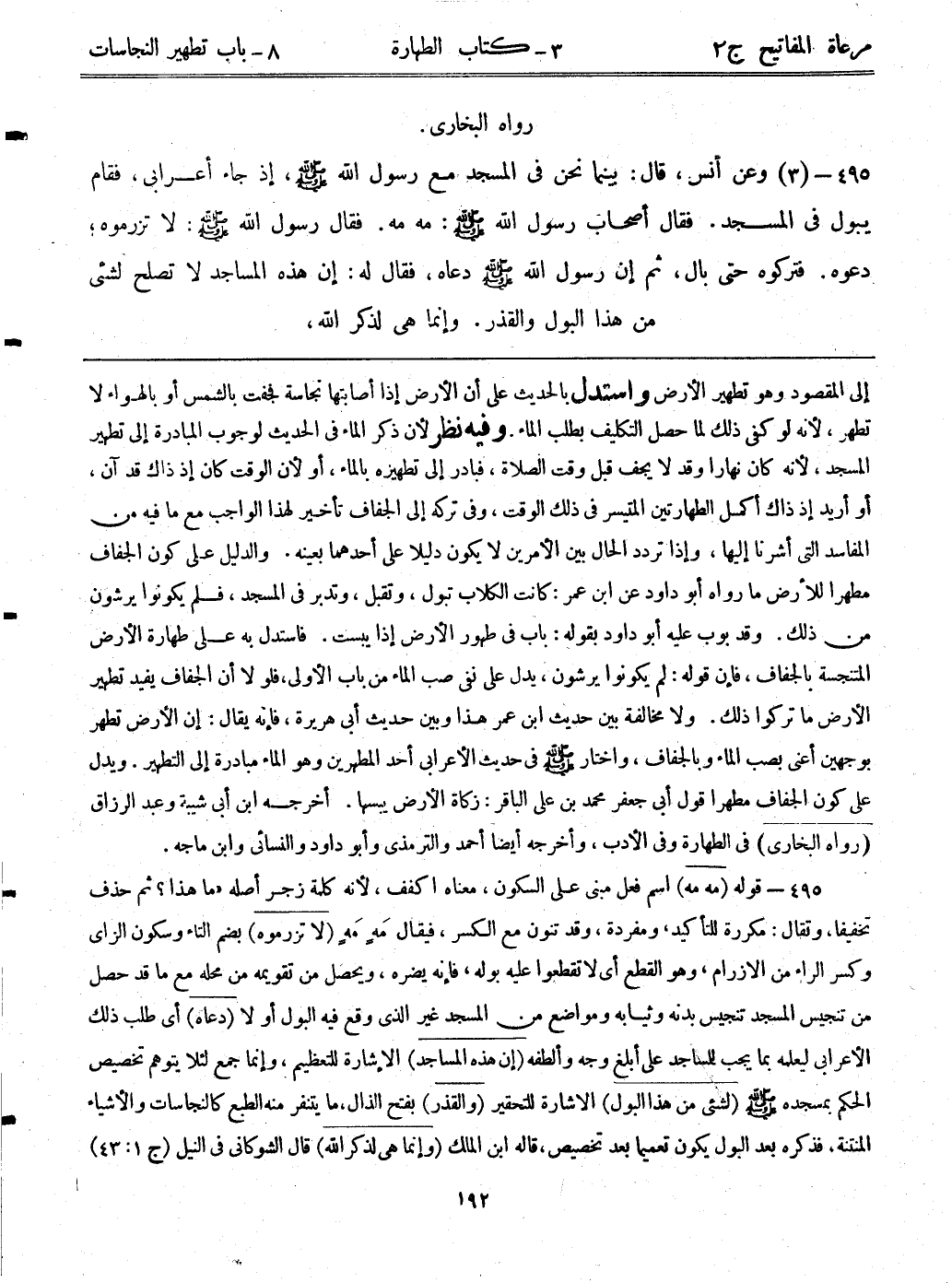 495- قوله: (مه مه) اسم فعل مبني على السكون، معناه اكفف، لأنه كلمة زجر أصله "ما هذا؟ ثم حذف تخفيفاً، وتقال: مكررة للتأكيد، ومفردة، وقد تنون مع الكسر، فيقال مَه مَه. (لا تزرموه) بضم التاء وسكون الزاى وكسر الراء من الازرام، وهو القطع أي: لا تقطعوا عليه بوله، فإنه يضره، ويحصل من تقويمه من محله مع ما قد حصل من تنجيس المسجد تنجيس بدنه وثيابه ومواضع من المسجد غير الذي وقع فيه البول أو لا. (دعاه) أي: طلب ذلك الأعرابي ليعلمه بما يجب للمساجد على أبلغ وجه وألطفه. (إن هذه المساجد) الإشارة للتعظيم، وإنما جمع لئلا يتوهم تخصيص الحكم بمسجده - صلى الله عليه وسلم -. (لشيء من هذا البول) الإشارة للتحقير. (والقذر) بفتح الذال، ما يتنفر منه الطبع كالنجاسات والأشياء المنتنة، فذكره بعد البول يكون تعميما بعد تخصيص، قاله ابن الملك. (وإنما هي لذكرالله) قال الشوكاني في النيل (ج1:ص43)