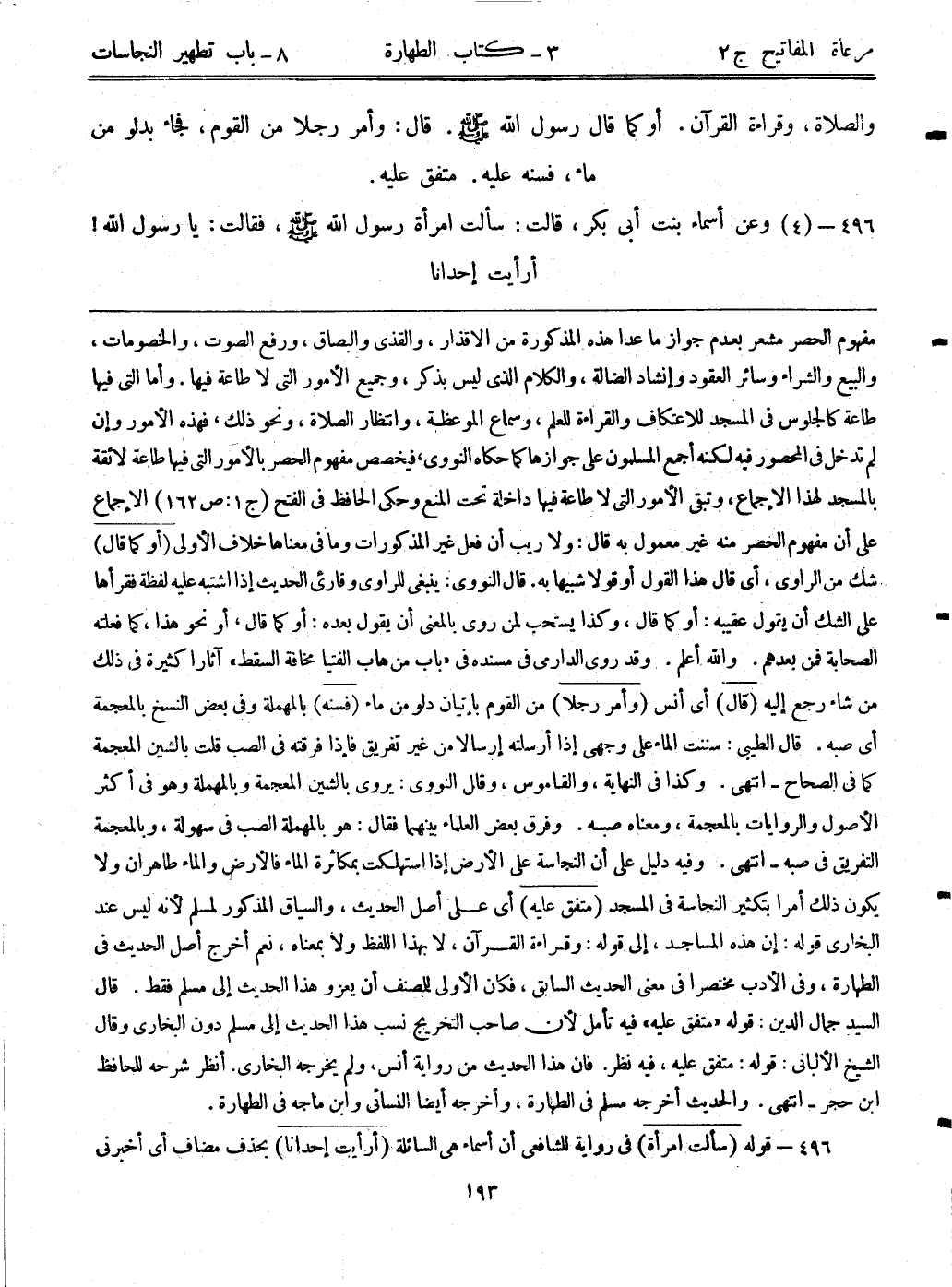496- (4) وعن أسماء بنت أبي بكر، قالت: ((سألت امرأة رسول الله - صلى الله عليه وسلم -، فقالت: يارسول الله! أرأيت إحدانا