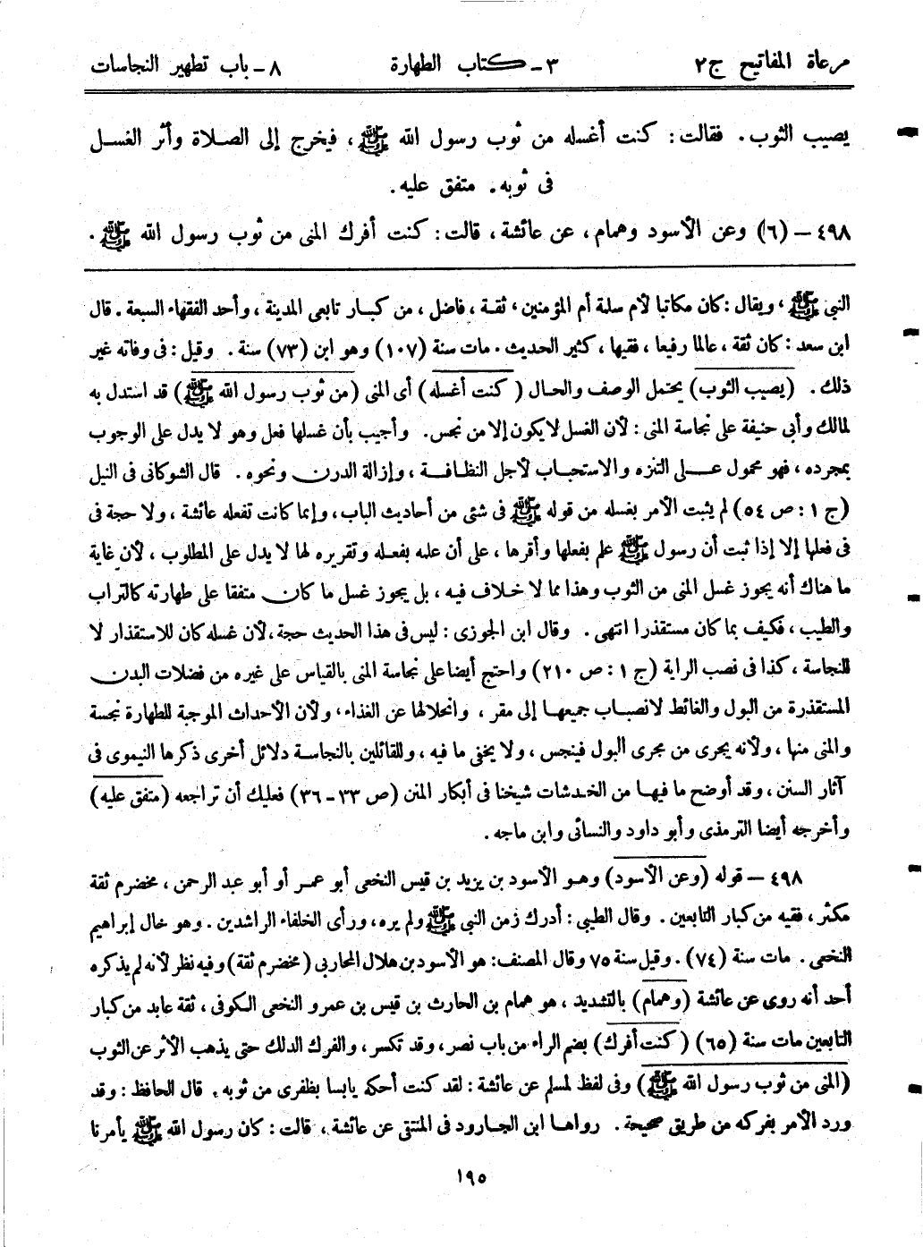 498- (6) وعن الأسود وهمام، عن عائشة قالت: ((كنت أفرك المنى من ثوب رسول الله - صلى الله عليه وسلم -)) .