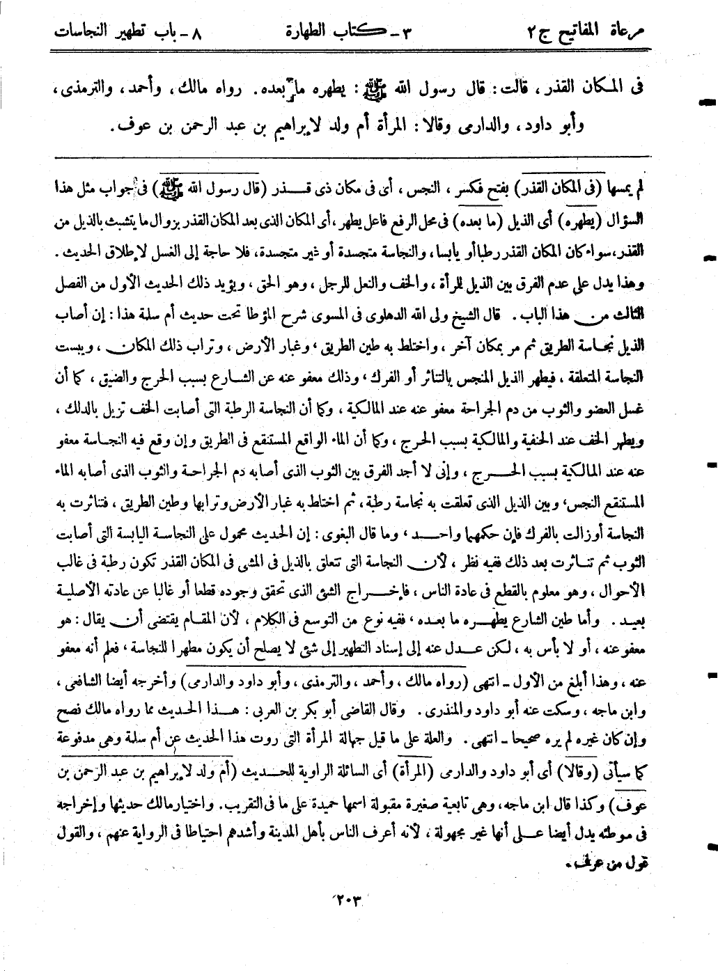 لم يمسها. (في المكان القذر) بفتح فكسر، النجس، أي: في مكان ذي قذر. (قال رسول الله - صلى الله عليه وسلم -) في جواب مثل هذا السؤال. (يطهره) أي: الذيل. (ما بعده) في محل الرفع فاعل يطهر، أي: المكان الذي بعد المكان القذر بزوال ما يتثبت بالذيل من القذر، سواء كان المكان القذر رطباً أو يابساً، والنجاسة متجسدة أو غير متجسدة، فلا حاجة إلى الغسل لإطلاق الحديث. وهذا يدل على عدم الفرق بين الذيل للمرأة، والخف والنعل للرجل، وهو الحق، ويؤيد ذلك الحديث الأول من الفصل الثالث من هذا الباب. قال الشيخ ولي الله الدهلوي في المسوى شرح المؤطا تحت حديث أم سلمة هذا: إن أصاب الذيل نجاسة الطريق ثم مر بمكان آخر، واختلط به طين الطريق، وغبار الأرض، وتراب ذلك المكان، ويبست النجاسة المتعلقة، فيطهر الذيل المنجس بالتناثر أو الفرك، وذلك معفو عنه عن الشارع بسبب الحرج والضيق، كما أن غسل العضو والثوب من دم الجراحة معفو عنه عند المالكية، وكما أن النجاسة الرطبة التي أصابت الخف تزيل بالدلك، ويطهر الخف عند الحنفية والمالكية بسبب الحرج، وكما أن الماء الواقع المستنقع في الطريق وإن وقع فيه النجاسة معفو عنه عند المالكية بسبب الحرج، وإني لا أجد الفرق بين الثوب الذي أصابه دم الجراحة والثوب الذي أصابه الماء المستنقع النجس، وبين الذيل الذي تعلقت به نجاسة رطبة، ثم اختلط به غبار الأرض وترابها وطين الطريق، فتناثرت به النجاسة أو زالت بالفرك فإن حكمها واحد، وما قال البغوي: إن الحديث محمول على النجاسة اليابسة التي أصابت الثوب ثم تناثرت بعد ذلك ففيه نطر، لأن النجاسة التي تتعلق بالذيل في المشى في المكان القذر تكون رطبة في غالب الأحوال، وهو معلوم بالقطع في عادة الناس، فإخراج الشيء الذي تحقق وجوده قطعاً أو غالباً عن عادته الأصلية بعيد. وأما طين الشارع يطهره ما بعده، ففيه نوع من التوسع في الكلام، لأن المقام يقتضي أن يقال: هو معفو عنه، أو لا بأس به، لكن عدل عنه إلى إسناد التطهير إلى شيء لا يصلح أن يكون مطهراً للنجاسة، فعلم أنه معفو عنه، وهذا أبلغ من الأول -انتهى. (رواه مالك، وأحمد، والترمذي، وأبوداود والدارمي) وأخرجه أيضاً الشافعي، وابن ماجه، وسكت عنه أبوداود والمنذري. وقال القاضي أبوبكر بن العربي: هذا الحديث مما رواه مالك فصح وإن كان غيره لم يره صحيحا- انتهى. والعلة على ما قيل جهالة المرأة التي روت هذا الحديث عن أم سلمة وهي مدفوعة كما سيأتي. (وقالا) أي: أبوداود والدارمي. (المرأة) أي: السائلة الراوية للحديث. (أم ولد لإبراهيم بن عبد الرحمن بن عوف) وكذا قال ابن ماجه، وهي تابعية صغيرة مقبولة اسمها حميدة على ما في التقريب. واختيار مالك حديثها وإخراجه في موطئه يدل أيضاً على أنها غير مجهولة، لأنه أعرف الناس بأهل المدينة وأشدهم احتياطاً في الرواية عنهم، والقول قول من عرف.