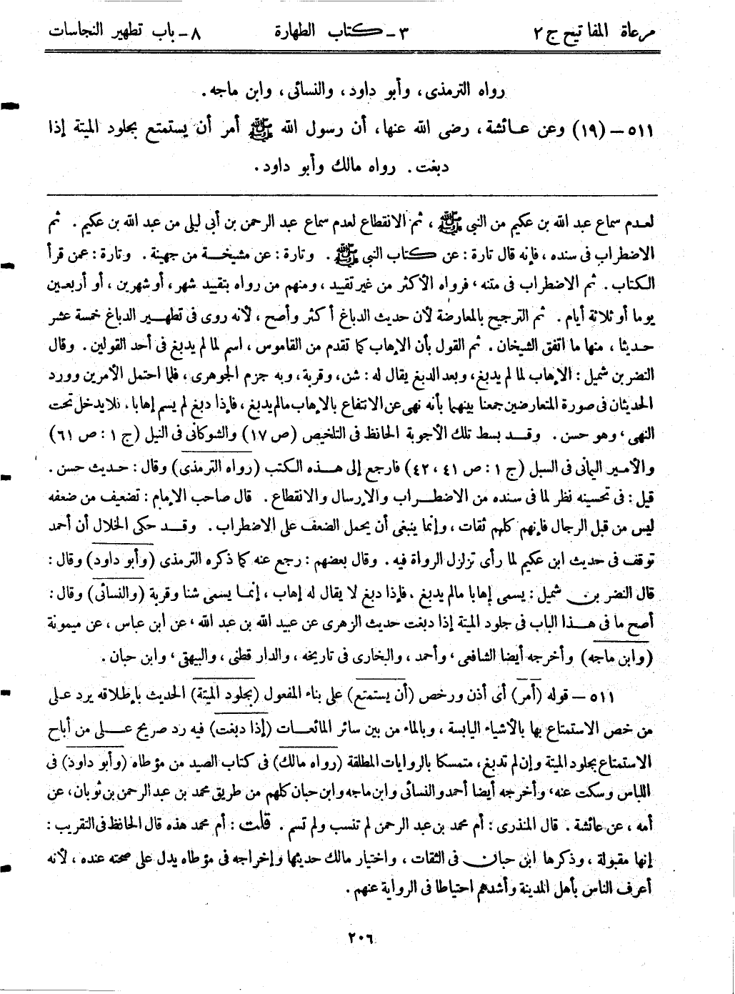 511- قوله: (أمر) أي: أذن ورخص. (أن يستمتع) على بناء المفعول. (بجلود الميتة) الحديث بإطلاقه يرد على من خص الاستمتاع بها بالأشياء اليابسة، وبالماء من بين سائر المائعات. (إذا دبغت) فيه رد صريح على من أباح الاستمتاع بجلود الميتة وإن لم تدبغ، متمسكا بالروايات المطلقة. (رواه مالك) في كتاب الصيد من مؤطاه. (وأبوداود) في اللباس وسكت عنه، وأخرجه أيضاً أحمد والنسائي وابن ماجه وابن حبان كلهم من طريق محمد بن عبد الرحمن بن ثوبان عن أمه، عن عائشة. قال المنذري: أم محمد بن عبد الرحمن لم تنسب ولم تسم. قلت: أم محمد هذه قال الحافظ في التقريب: إنها مقبولة، وذكرها ابن حبان في الثقات، واختيار مالك حديثها وإخراجه في مؤطاه يدل على صحته عنده، لأنه أعرف الناس بأهل المدينة وأشدهم احتياطا في الرواية عنهم.