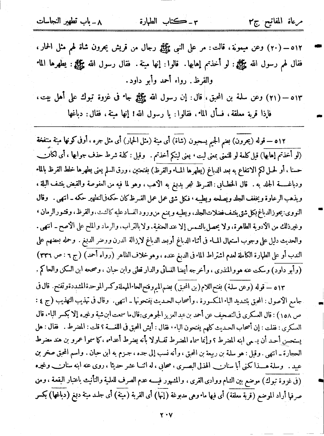 513- قوله: (وعن سلمة) بفتح اللام. (بن المحبق) بضم الميم وفتح الحاء المهملة وكسر الموحدة المشددة وتفتح. قال في جامع الأصول: المحبق بتشديد الباء المكسورة، وأصحاب الحديث يفتحونها - انتهى. وقال في تهذيب التهذيب (ج4:ص158) : قال العسكري في التصحيف عن أحمد بن عبد العزيز الجوهري: قال ما سمعت ابن شبة وغيره إلا بكسر الباء، قال العسكري: فقلت: إن أصحاب الحديث كلهم يفتحون الباء، فقال: أيش المحبق في اللغة؟ قلت: المضرط. فقال: هل يستحسن أحد أن يسمى ابنه المضرط؟ وإنما سماه المضرط تفاؤلاً بأنه يضرط أعداءه كما سموا عمرو بن هند مضرط الحجارة - انتهى. وقيل: هو سلمة بن ربيعة بن المحبق، وأنه نسب إلى جده، جزم به ابن حبان. واسم المحبق صخر بن عبيد. وسلمة هذا يكنى أبا سنان الهذلي البصري، صحابي، له اثنا عشر حديثاً، روى عنه ابنه سنان وغيره. (في غزوة تبوك) موضع بين الشام ووادي القرى، والمشهور فيه عدم الصرف للعلمية والتأنيث باعتبار البقعة، ومن صرفها أراد الموضع. (قربة معلقة) أي: فيها ماء وهي مدبوغة. (إنها) أي: القربة. (ميتة) أي: جلد ميتة دبغ. (دباغها) بكسر