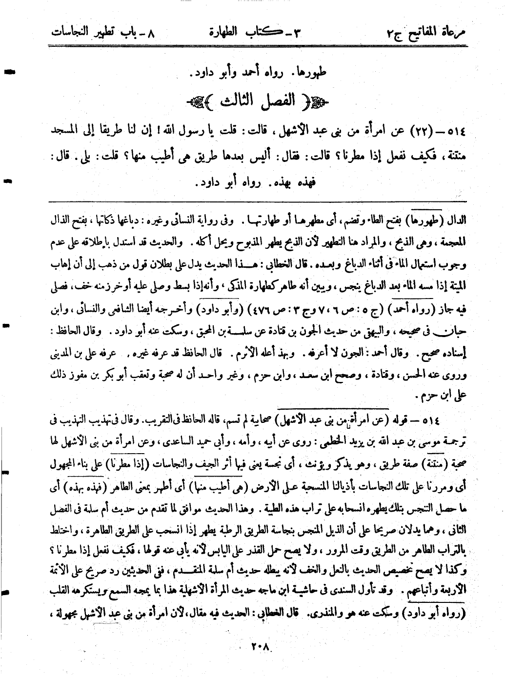 514- (22) عن امرأة من بني عبد الأشهل، قالت: قلت يارسول الله! إن لنا طريقاً إلى المسجد منتنة، فكيف نفعل إذا مطرنا؟ قالت: فقال: ((أليس بعدها طريق هي أطيب منها؟ قلت: بلى. قال: فهذه بهذه)) . رواه أبوداود.