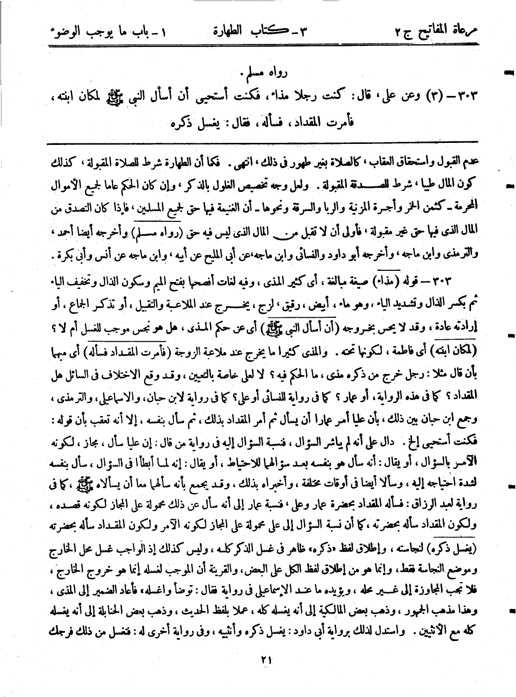 303- (3) وعن علي، قال: قال: ((كنت رجلاً مذاء، فكنت أستحيي أن أسأل النبي - صلى الله عليه وسلم - لمكان ابنته، فأمرت المقداد، فسأله، فقال: يغسل ذكره