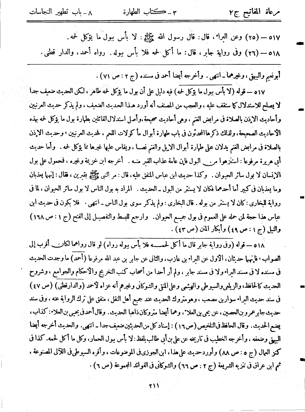 518- (26) وفي رواية جابر، قال: ((ما أكل لحمه فلا بأس ببوله)) رواه أحمد، والدارقطني.