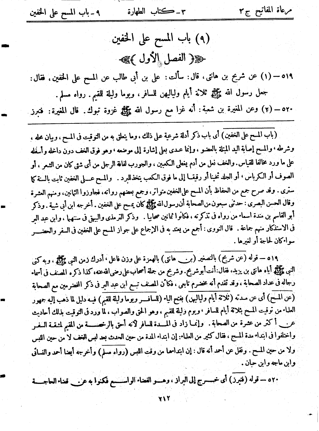 519- (1) عن شريح بن هانئ، قال: سألت: علي بن أبي طالب عن المسح على الخفين، فقال: