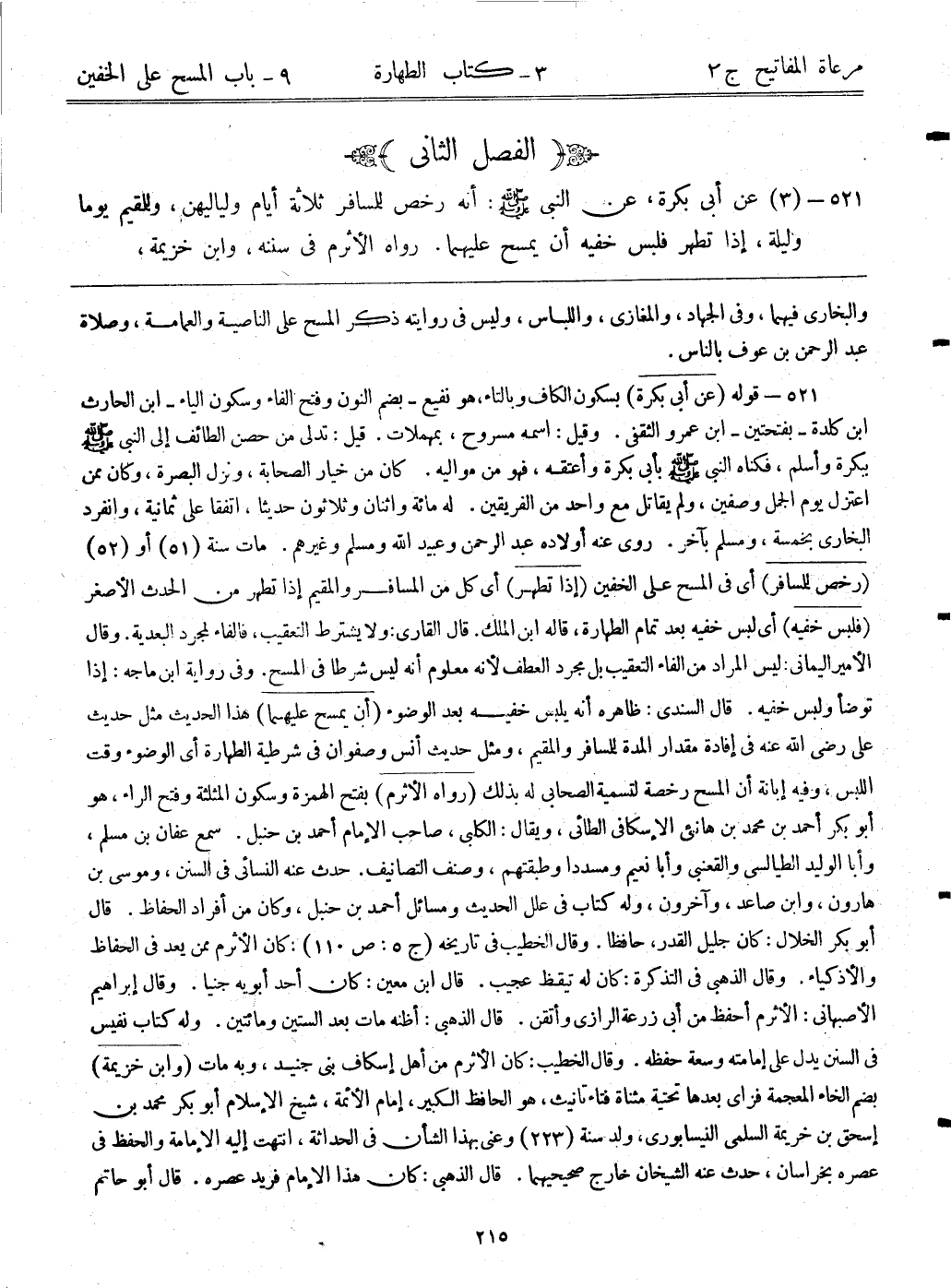 521- قوله: (عن أبي بكرة) بسكون الكاف وبالتاء، هو نفيع - بضم النون وفتح الفاء وسكون الياء - ابن الحارث ابن كلدة - بفتحتين - ابن عمرو الثقفي. وقيل: اسمه مسروح، بمهملات. قيل: تدلى من حصن الطائف إلى النبي - صلى الله عليه وسلم - ببكرة وأسلم، فكناه النبي - صلى الله عليه وسلم - بأبي بكرة وأعتقه، فهو من مواليه. كان من خيار الصحابة، ونزل البصرة، وكان ممن اعتزل يوم الجمل وصفين، ولم يقاتل مع واحد من الفريقين. له مائة واثنان وثلاثون حديثاً، اتفقا على ثمانية، وانفرد البخاري بخمسة، ومسلم بآخر. روى عنه أولاده عبد الرحمن وعبيد الله ومسلم وغيرهم. مات سنة (51) أو (52) . (رخص للمسافر) أي: في المسح على الخفين. (إذا تطهر) أي: كل من المسافر والمقيم إذا تطهر من الحدث الأصغر. (فلبس خفيه) أي: لبس خفيه بعد تمام الطهارة، قاله ابن الملك. قال القاري: ولا يشترط التعقيب، فالفاء لمجرد البعدية. وقال الأمير اليماني: ليس المراد من الفاء التعقيب بل مجرد العطف لأنه معلوم أنه ليس شرطاً في المسح. وفي رواية ابن ماجه: إذا توضأ ولبس خفيه. قال السندي: ظاهره أنه يلبس خفيه بعد الوضوء. (أن يمسح عليهما) هذا الحديث مثل حديث علي رضي الله عنه في إفادة مقدار المدة للمسافر والمقيم، ومثل حديث أنس وصفوان في شرطية الطهارة أي: الوضوء وقت اللبس، وفيه إبانة أن المسح رخصة لتسمية الصحابي له بذلك. (رواه الأثرم) بفتح الهمزة وسكون المثلثة وفتح الراء، هو أبوبكر أحمد بن محمد بن هانئ الإسكافي الطائي، ويقال: الكلبي، صاحب الإمام أحمد بن حنبل، سمع عفان بن مسلم، وأبا الوليد الطيالسي والقعنبي وأبا نعيم ومسدداً وطبقتهم، وصنف التصانيف. حدث عنه النسائي في السنن، وموسى بن هارون، وابن صاعد، وآخرون، وله كتاب في علل الحديث ومسائل أحمد بن حنبل، وكان من أفراد الحفاظ. قال أبوبكر الخلال: كان جليل القدر، حافظاً. وقال الخطيب في تاريخه (ج5:ص110) : كان الأثرم ممن يعد في الحفاظ والأذكياء. وقال الذهبي في التذكرة: كان له تيقظ عجيب. قال ابن معين: كان أحد أبويه جنياً. وقال إبراهيم الأصبهاني: الأثرم أحفظ من أبي زرعة الرازي وأتقن. قال الذهبي: أظنه مات بعد الستين ومائتين. وله كتاب نفيس في السنن يدل على إمامته وسعة حفظه. وقال الخطيب: كان الأثرم من أهل إسكاف بني جنيد، وبه مات (وابن خزيمة) بضم الخاء المعجمة فزأي بعدها تحتية مثناة فتاء تأنيث، هو الحافظ الكبير، إمام الأئمة، شيخ الإسلام أبوبكر محمد بن إسحق بن خزيمة السلمي النيسابوري، ولد سنة (223) وعنى بهذا الشأن في الحداثة، انتهت إليه الإمامة والحفظ في عصره بخراسان، حدث عنه الشيخان خارج صحيحهما. قال: الذهبي: كان هذا الإمام فريد عصره. قال أبوحاتم