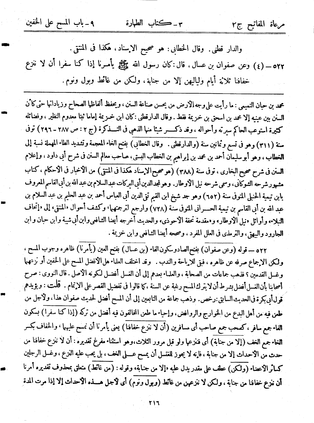 522- قوله: (وعن صفوان) بفتح الصاد وسكون الفاء. (بن عسال) بفتح العين. (يأمرنا) ظاهره وجوب المسح، ولكن الإجماع صرفه عن ظاهره، فبقى للإباحة والندب. وقد اختلف العلماء هل الأفضل المسح على الخفين أو نزعهما وغسل القدمين؟ فذهب جماعات من الصحابة، والعلماء بعدهم إلى أن الغسل أفضل لكونه الأصل. قال النووي: صرح أصحابنا بأن الغسل أفضل بشرط أن لا يترك المسح رغبة عن السنة، كما قالوا في تفضيل القصر على الإتمام. قلت: ويؤيدهم قول أبي بكرة في الحديث السابق: رخص. وذهب جماعة من التابعين إلى أن المسح أفضل لحديث صفوان هذا، ولأجل من طعن فيه من أهل البدع من الخوارج والروافض، وإحياء ما طعن المخالفون فيه أفضل من تركه. (إذا كنا سفراً) بسكون الفاء جمع سافر، كصحب جمع صاحب أي مسافرين. (أن لا ننزع خفافنا) يعني يأمرنا أن نمسح عليهما، والخفاف بكسر الخاء جمع الخف. (إلا من جنابة) أي: فنزعهما ولو قبل مرور الثلاث، وهو استثناء مفرغ تقديره: أن لا ننزع خفافنا من حديث من الأحداث إلا من جنابة، فإنه لا يجوز للمغتسل أن يمسح على الخف، بل يجب عليه النزع، وغسل الرجلين كسائر الأعضاء. (ولكن) عطف على مقدر يدل عليه "إلا من جنابة" وقوله: (من غائط) متعلق بمحذوف تقديره أمرنا أن ننزع خفافنا من جنابة، ولكن لا ننزعهن من غائط. (وبول ونوم) أي: لأجل هذه الأحداث إلا إذا مرت المدة