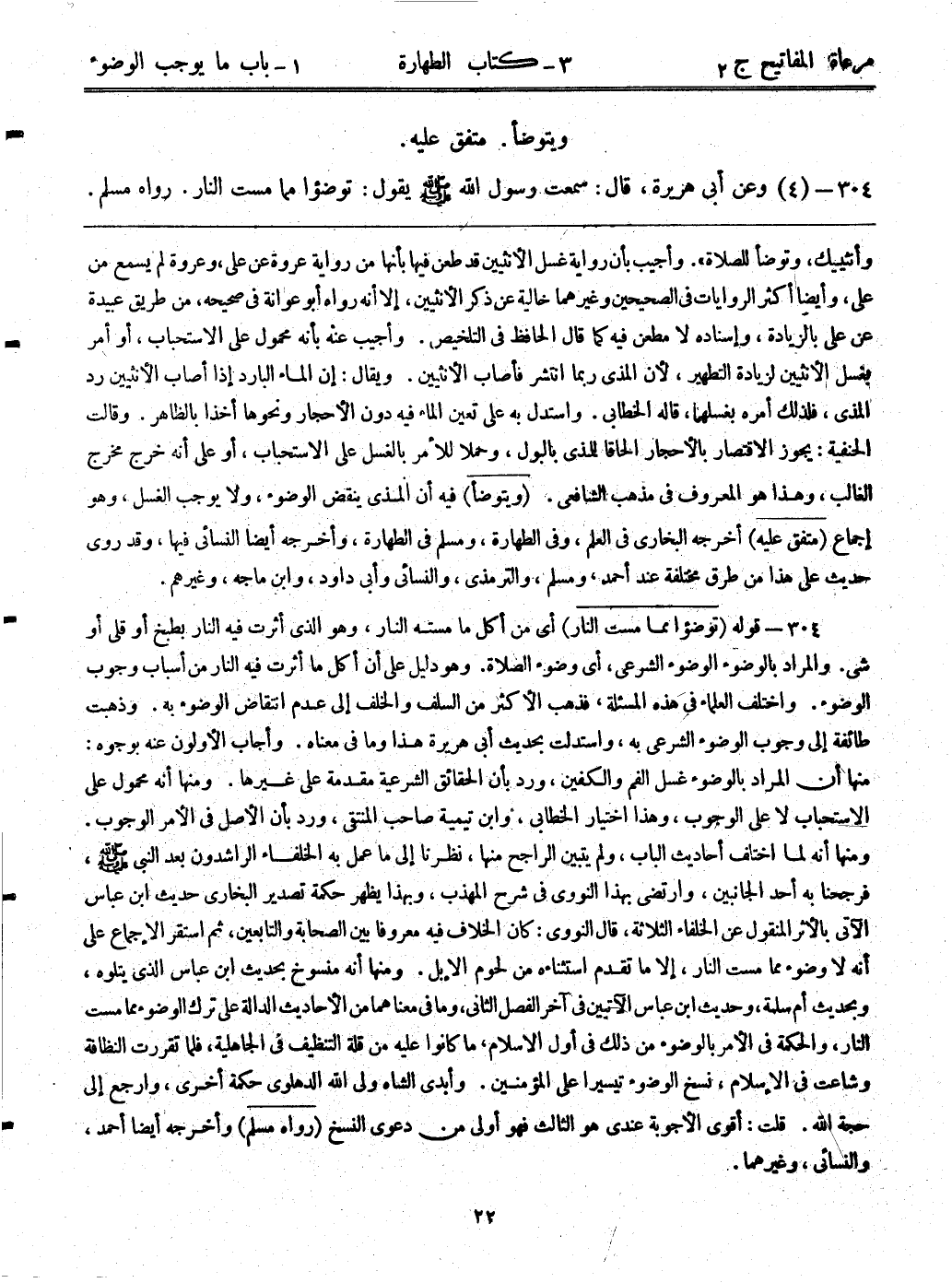 304- قوله: (توضؤوا مما مست النار) أي من أكل ما مسته النار، وهو الذى أثرت فيه النار بطبخ أو قلي أو شي. والمراد بالوضوء الوضوء الشرعي، أي وضوء الصلاة. وهو دليل على أن أكل ما أثرت فيه النار من أسباب وجوب الوضوء. واختلف العلماء في هذه المسألة، فذهب الأكثر من السلف والخلف إلى عدم انتقاض الوضوء به. وذهبت طائفة إلى وجوب الوضوء الشرعي به، واستدلت بحديث أبي هريرة هذا وما في معناه. وأجاب الأولون عنه بوجوه: منها أن المراد بالوضوء غسل الفم والكفين، ورد بأن الحقائق الشرعية مقدمة على غيرها. ومنها أنه محمول على الاستحباب لا على الوجوب، وهذا اختيار الخطابي، وابن تيمية صاحب المنتقى، ورد بأن الأصل في الأمر الوجوب. ومنها أنه لما اختلف أحاديث الباب، ولم يتبين الراجح منها، نظرنا إلى ما عمل به الخلفاء الراشدون بعد النبي - صلى الله عليه وسلم -، فرجحنا به أحد الجانبين، وارتضى بهذا النووي في شرح المهذب، وبهذا يظهر حكمة تصدير البخاري حديث ابن عباس الآتي بالأثر المنقول عن الخلفاء الثلاثة، قال النووي: كان الخلاف فيه معروفاً بين الصحابة والتابعين، ثم استقر الإجماع على أنه لا وضوء مما مست النار، إلا ما تقدم استثناه من لحوم الإبل. ومنها أنه منسوخ بحديث ابن عباس الذى يتلوه، وبحديث أم سلمة، وحديث ابن عباس الآتيين في آخر الفصل الثاني، وما في معناهما من الأحاديث الدالة على ترك الوضوء مما مست النار، والحكمة في الأمر بالوضوء من ذلك في أول الإسلام، ما كانوا عليه من قلة التنظيف في الجاهلية، فلما تقررت النظافة وشاعت في الإسلام، نسخ الوضوء تيسيراً على المؤمنين. وأبدى الشاه ولي الله الدهلوي حكمة أخرى، وارجع إلى حجة الله. قلت: أقوى الأجوبة عندي هو الثالث فهو أولى من دعوى النسخ. (رواه مسلم) وأخرجه أيضاً أحمد، والنسائي، وغيرهما.