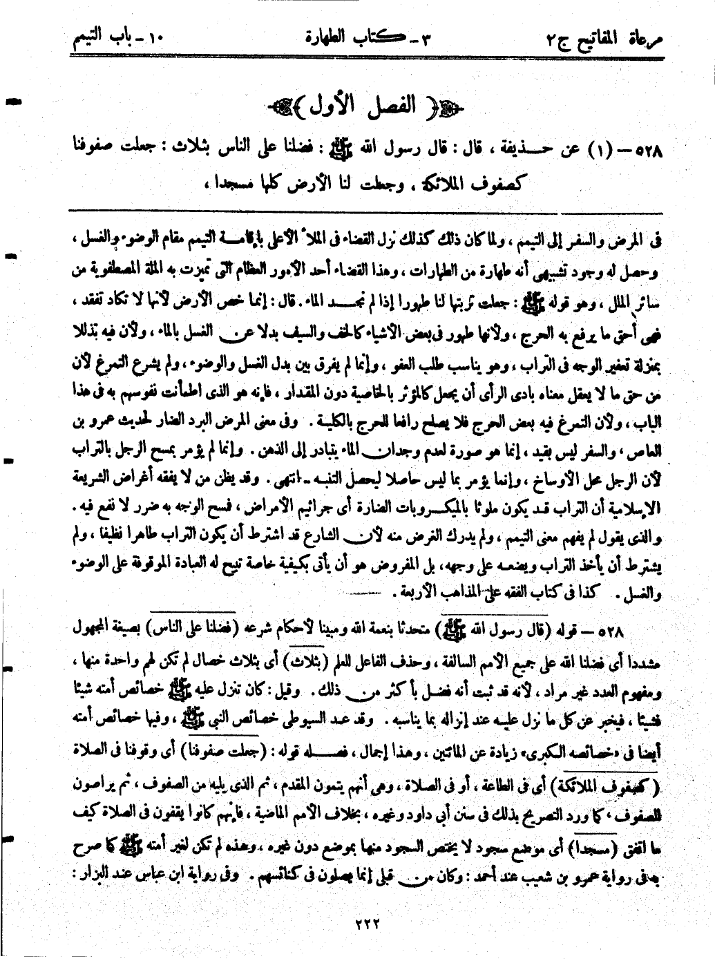 528- (1) عن حذيفة، قال: قال: رسول الله - صلى الله عليه وسلم -: ((فضلنا على الناس بثلاث: جعلت صفوفنا كصفوف الملائكة، وجعلت لنا الأرض كلها مسجداً،