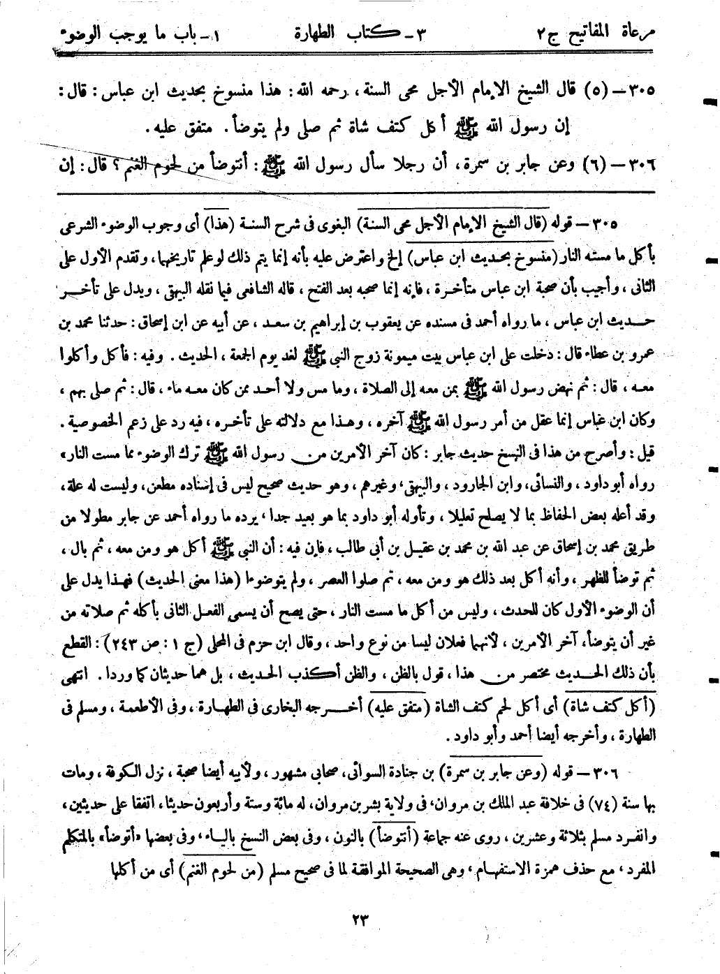 305- (5) قال الشيخ الإمام الأجل محي السنة، رحمه الله: هذا منسوخ بحديث ابن عباس: قال. ((إن رسول الله - صلى الله عليه وسلم - أكل كتف شاة ثم صلى ولم يتوضأ)) متفق عليه.