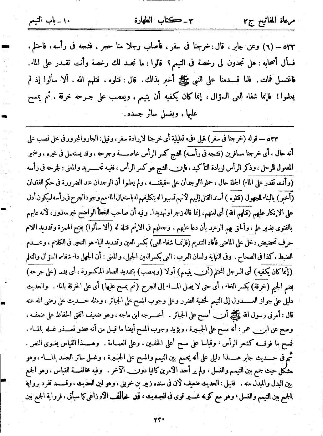 533- قوله: (خرجنا في سفر) قيل: "في" تعليلية أي: خرجنا لإرادة سفر، وقيل: الجار والمجرور في محل نصب على أنه حال، أي: خرجنا مسافرين. (فشجه في رأسه) الشج كسر الرأس خاصة وجرحه، وقد يستعمل في غيره، وضمير المفعول للرجل، وذكر الرأس لزيادة التأكيد، فإن الشج هو كسر الرأس، ففيه تجريد والمعنى: فجرحه في رأسه. (وأنت تقدر على الماء) الجملة حال، حملوا الوجدان على حقيقته، ولم يعلموا أن الوجدان عند الضرورة في حكم الفقدان. (أخبر) بالبناء للمجهول. (قتلوه) أسند القتل إليهم لأنهم تسببوا له بتكليفهم له باستعمال الماء مع وجود الجرح في رأسه ليكون أدل على الإنكار عليهم. (قتلهم الله) أي: لعنهم، إنما قاله زجراً وتهديداً. وفيه أن صاحب الخطأ الواضح غير معذور، لأنه عابهم بالفتوى بغير علم، وألحق بهم الوعيد بأن دعا عليهم، وجعلهم في الإثم قتلة له. (ألا سألوا) بفتح الهمزة وتشديد اللام حرف تحضيض دخل على الماضي فأفاد التنديم. (فإنما شفاء العي) بكسر العين وتشديد الياء هو التحير في الكلام، وعدم الضبط، كذا في الصحاح. وفي النهاية ولسان العرب: العي بكسر العين الجهل، والمعنى: أن الجهل داء شفاءه السؤال والتعلم. (إنما كان يكفيه) أي: الرجل المحتلم. (أن يتيمم) أولاً. (ويعصب) بتشديد الصاد المكسورة، أي: يشد. (على جرحه) بضم الجيم. (خرقة) بكسر الخاء، أي: حتى لا يصل الماء إلى الجرح. (ثم يمسح عليها) أي: على الخرقة بالماء. والحديث دليل على جواز العدول إلى التيمم لخشية الضرر وعلى وجوب المسح على الجبائر، ومثله حديث على رضي الله عنه قال: أمرني رسول الله - صلى الله عليه وسلم - أن أمسح على الجبائر. أخرجه ابن ماجه، وهو ضعيف اتفق الحفاظ على ضعفه، وصح عن ابن عمر: أنه مسح على الجبيرة، ويؤيد وجوب المسح أيضاً ما قيل من أنه عضو تعذر غسله بالماء، فمسح ما فوقه كشعر الرأس، وقياسا على مسح أعلى الخفين, وعلى العمامة، وهذا القياس يقوي النص. ثم في حديث جابر هذا دليل على أنه يجمع بين التيمم والمسح على الجبيرة، وغسل سائر الجسد بالماء، وهو الجمع بين التيمم والغسل، ولم ير أحد الأمرين كافياً دون الآخر. وفيه مخالفة القياس، وهو الجمع بين البدل والمبدل منه. فقيل: الحديث ضعيف لأن في سنده زبير بن خريق، وهو لين الحديث، وقد برواية الجمع بين التيمم والغسل، وهو مع كونه غير قوي في الحديث، قد خالف الأوزاعي كما سيأتي، فرواية الجمع بين