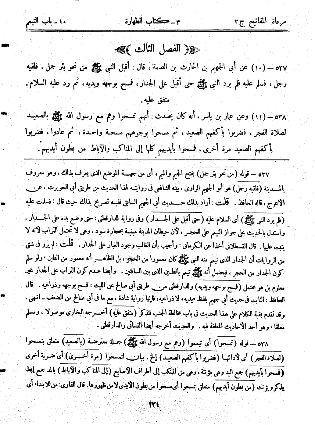 537- قوله: (من نحو بئر جمل) بفتح الجيم والميم، أي: من جهة الموضع الذي يعرف بذلك، وهو معروف بالمدينة. (فلقيه رجل) هو أبوالجهيم الراوي، بينه الشافعي في روايته لهذا الحديث من طريق أبي الحويرث، عن الأعرج، قاله الحافظ. قلت: أراد بذلك حديث أبي الجهيم السابق ففيه تصريح بذلك حيث قال: فسلمت عليه. (فلم يرد النبي - صلى الله عليه وسلم -) أي: السلام عليه. (حتى أقبل على الجدار) وفي رواية للدارقطني: حتى وضع يده على الجدار. واستدل بالحديث على جواز التيمم على الحجر، لأن حيطان المدينة مبنية بحجارة سود، وهي لا تحتمل التراب لأنه لا يثبت عليها. قال القسطلاني أخذاً عن الكرماني: وأجيب بأن الغالب وجود الغبار على الجدار. قلت: لم يرو في شيء من الروايات أن الجدار الذي تيمم منه النبي - صلى الله عليه وسلم - كان معموراً من الحجر، بل الظاهر أنه معمور من الطين، ولو سلم كون الجدار من الحجر، فيحتمل أنه - صلى الله عليه وسلم - تيمم بالطين الذي بين السافتين. وأيضاً عدم كون التراب على الجدار غير معلوم بل هو محتمل. (فمسح بوجهه ويديه) وللدارقطني من طريق أبي صالح عن الليث: فمسح بوجهه وذراعيه. قال الحافظ: الثابت في حديث أبي جهيم بلفظ "يديه" لا ذراعيه، فإنها رواية شاذة، مع ما في أبي صالح من الضعف - انتهى. وقد تقدم بقية الكلام على هذا الحديث في باب مخالطة الجنب فتذكر. (متفق عليه) أخرجه البخاري موصولاً، ومسلم معلقاً، وهو أحد الأحاديث المعلقة فيه. والحديث أخرجه أيضاً النسائي والدارقطني.