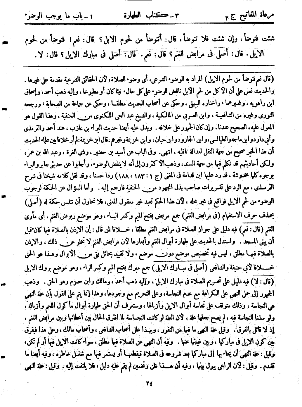 (قال: نعم، فتوضأ من لحوم الإبل) المراد به الوضوء الشرعي، أي وضوء الصلاة، لأن الحقائق الشرعية مقدمة على غيرها. والحديث نص على أن الأكل من لحم الإبل ناقص للوضوء على كل حال، نيئاً كان أو مطبوخاً، وإليه ذهب أحمد، وإسحاق ابن راهوية، وغيرهما، واختاره البيهقي، وحكى عن أصحاب الحديث مطلقاً، وحكى عن جماعة من الصحابة، ورجحه النووي وغيره من الشافعية، وابن العربي من المالكية، والشيخ عبد الحي اللكنوى من الحنفية، وهذا القول هو المعمول عليه، الصحيح عندنا، وإن كان الجمهور على خلافه. ويدل عليه أيضاً حديث البراء بن عازب، عند أحمد والترمذى وأبي داود وابن ماجه والطيالسي، وابن الجارود وابن حبان، وابن خزيمة وغيرهم، قال ابن خزيمة: لم أر خلافاً بين علماء الحديث أن هذا الخبر صحيح من جهة النقل لعدالة ناقليه، انتهى. وفي الباب عن أسيد بن حضير، وذى الغرة، وعبد الله بن عمر، ولكن أحاديثهم قد تكلم فيها من جهة السند، وذهب الأكثرون إلى أنه لا ينقص الوضوء، وأجابوا عن حديثي جابر والبراء بوجوه كلها مخدوشة، قد رد عليها ابن قدامة في المغني (ج1: ص188، 183) رداً حسناً، وقد نقل كلامه شيخنا في شرح الترمذي، مع الرد على تقريرات صاحب بذل المجهور من الحنفية فارجع إليه. وأما السؤال عن الحكمة لوجوب الوضوء من لحم الإبل فواقع في غير محله؛ لأن هذا الحكم تعبد غير معقول المعنى، فلا نحاول أن نتلمس حكمة له. (أصلي) بحذف حرف الاستفهام. (في مرابض الغنم) جمع مربض بفتح الميم وكسر الباء، وهو موضع ربوض الغنم، أي مأوى الغنم. (قال: نعم) فيه دليل على جواز الصلاة في مرابض الغنم مطلقاً، خلافاً لمن قال: إن الإذن بالصلاة فيها كان قبل أن يبنى المسجد. واستدل بالحديث على طهارة أبوال الغنم وأبعادها؛ لأن مرابض الغنم لا تخلو عن ذلك، والإذن بالصلاة فيها مطلق، ليس فيه تخصيص موضع دون موضع، ولا تقييد بحائل بقى من الأبوال وهذا هو الحق خلافاً لأبي حنيفة والشافعي. (أصلي في مبارك الإبل) جمع مبرك بفتح الميم وكسر الراء، وهو موضع بروك الإبل. (قال: لا) فيه دليل على تحريم الصلاة في مبارك الإبل، وإليه ذهب أحمد، ومالك وابن حزم وهو الحق. وذهب الجمهور إلى حمل النهي على الكراهة مع عدم النجاسة، وعلى التحريم مع وجودها، وهذا إنما يتم على القول بأن علة النهي هي النجاسة، وذلك متوقف على نجاسة أبوال الإبل وأزبالها، وستعرف أن الحق طهارة أبوال مأكول اللحم وأزباله، ولو سلمنا النجاسة فيه لم يصح جعلها علة؛ لأن العلة لو كانت النجاسة لما افترق الحال بين أعطانها وبين مرابض الغنم، إذ لا قائل بالفرق. وقيل علة النهي ما فيها من النفور، وبهذا علل أصحاب الشافعي، وأصحاب مالك، وعلى هذا فيفرق بين كون الإبل في مباركها، وبين غيبتها عنها. وفيه أن النهي عن الصلاة فيها مطلق، سواء كانت الإبل فيها أو لم تكن، وقيل: علة النهي أن يجاء بها إلى مباركها بعد شروعه في الصلاة فيقطعها أو يستمر فيها مع شغل خاطره، وفيه أيضاً ما تقدم. وقيل: لأن الراعي يبول بينها، وفيه أن هذا ظن وتخمين لم يقم عليه دليل، فلا يلتفت إليه. وقيل: علة النهي