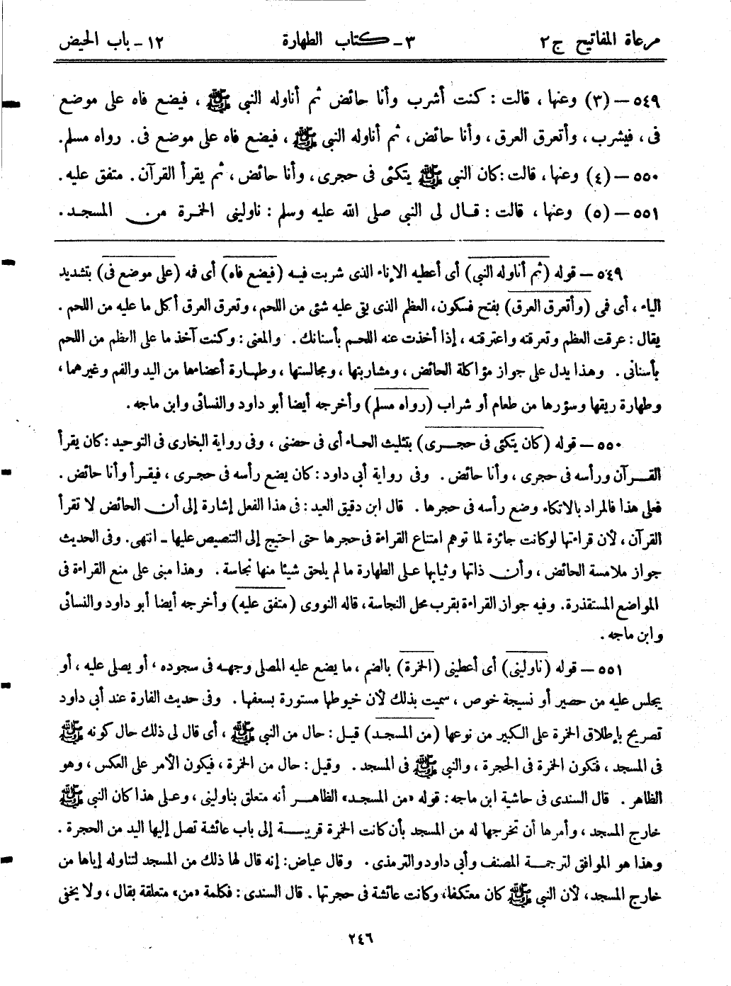 549- قوله: (ثم أناوله النبي) أي: أعطيه الإناء الذي شربت فيه. (فيضع فاه) أي: فمه. (على موضع في) بتشديد الياء، أي: فمي. (وأتعرق العرق) بفتح فسكون، العظم الذي بقي عليه شيء من اللحم، وتعرق العرق أكل ما عليه من اللحم. يقال: عرقت العظم وتعرقته واعترقته، إذا أخذت عنه الحم بأسنانك. والمعنى: وكنت آخذ ما على العظم من اللحم بأسناني. وهذا يدل على جواز مؤاكلة الحائض، ومشاربتها، ومجالستها، وطهارة أعضائها من اليد والفم وغيرهما، وطهارة ريقها وسؤرها من طعام أو شراب. (رواه مسلم) وأخرجه أيضاً أبوداود والنسائي وابن ماجه.