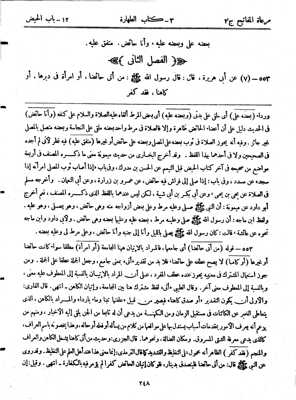 553- (7) عن أبي هريرة، قال: قال رسول الله - صلى الله عليه وسلم -: ((من أتى حائضاً، أوامرأة في دبرها، أوكاهناً، فقد كفر