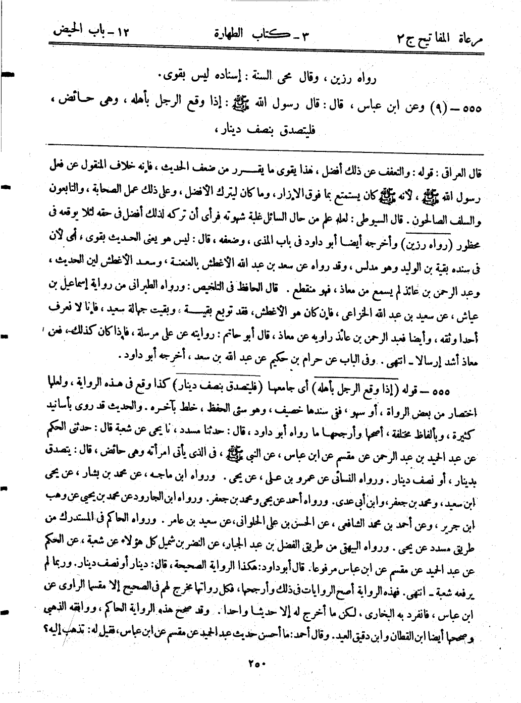 555- (9) وعن ابن عباس، قال: قال رسول الله - صلى الله عليه وسلم -: ((إذا وقع الرجل بأهله، وهي حائض، فليتصدق بنصف دينار،