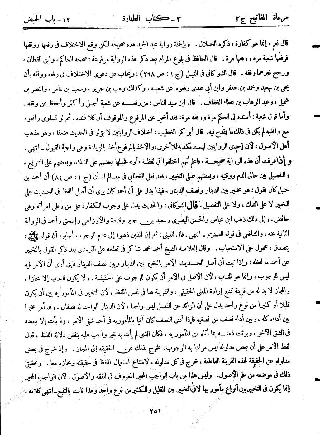 قال: نعم، إنما هو كفارة، ذكره الخلال. وبالجملة رواية عبد الحميد هذه صحيحة لكن وقع الاختلاف في رفعها ووقفها فرفعها شعبة مرة ووقفها مرة. قال الحافظ في بلوغ المرام بعد ذكر هذه الرواية مرفوعة: صححه الحاكم، وابن القطان، ورجح غيرهما وقفه. قال الشوكاني في النيل (ج1:ص268) : ويجاب عن دعوى الاختلاف في رفعه ووقفه بأن يحيى بن سعيد ومحمد بن جعفر وابن أبي عدى رفعوه عن شعبة، وكذلك وهب بن جرير، وسعيد بن عامر، والنضر بن شميل، وعبد الوهاب بن عطاء الخفاف. قال: ابن سيد الناس: من رفعه عن شعبة أجل وأكثر وأحفظ ممن وقفه. وأما قول شعبة: أسنده لي الحكم مرة ووقفه مرة، فقد أخبر عن المرفوع والموقوف أن كلا عنده، ثم لو تساوي رافعوه مع واقفيه لم يكن في ذلك ما يقدح فيه. قال: أبوبكر الخطيب: إختلاف الروايتين لا يؤثر في الحديث ضعفا، وهو مذهب أهل الأصول، لأن إحدى الروايتين ليست مكذبة لأخرى، والأخذ بالمرفوع بالزيادة وهي واجبة القبول-انتهى. وإذا عرفت أن هذه الرواية صحيحة، فاعلم أنهم اختلفوا في لفظه "أو" فحملها بعضهم على الشك، وبعضهم على التنويع، والتفصيل بين حالي الدم ووقتيه، وبعضهم على التخيير، فقد نقل الخطابي في معالم السنن (ج1:ص84) أن أحمد بن حنبل كان يقول: وهو مخير بين الدينار ونصف الدينار، فهذا يدل على أن أحمد كان يرى أن أصل اللفظ في الحديث على التخيير لا على الشك، ولا على التفصيل. قال الشوكاني: والحديث يدل على وجوب الكفارة على من وطى امرأته وهي حائض، وإلى ذلك ذهب ابن عباس والحسن البصري، وسعيد بن جبير وقتادة والأوزاعي وإسحق وأحمد في الرواية الثانية عنه، والشافعي في قوله: القديم – انتهى. قال العيني: ثم إن الذين ذهبوا إلى عدم الوجوب أجابوا أن قوله - صلى الله عليه وسلم -: يتصدق، محمول على الاستحباب. وقال العلامة الشيخ أحمد محمد شاكر في تعليقه على الترمذي بعد ذكر القول بالتخيير عن أحمد ما لفظه: وإذا ثبت أن أصل الحديث الأمر بالتخيير بين الدينار وبين نصف الدينار فإني أي: أن الأمر فيه ليس للوجوب، وإنما هو للندب، لأن الأصل في الأمر أن يكون للوجوب على الحقيقة. ولا يكون للندب إلا مجازاً، والمجاز لا بد له من قرينة تمنع إرادة المعنى الحقيقي، والقرينة هنا في نفس اللفظ، لأن التخيير في المأمور به بين أن يكون قليلاً أو كثيراً من نوع واحد يجل على أن الزائد عن القليل ليس واجباً، لأن الدينار الواحد له نصفان، وقد أمر مخيراً بين أداءه كله، وبين أداء نصف من نصفيه فإذا أدى النصف كان آتيا بالمأمور به في أحد شقى الأمر، ولم يأت إلا ببعضه في الشق الآخر، وبرئت ذمته بما أتاه من المأمور به، فكان الذي لم يأت به غير واجب بنفس دلالة اللفظ، فدل لفظ الأمر على أن بعض مدلوله ليس مراداً به الوجوب، فخرج بذلك عن الحقيقة إلى المجاز. وإذ خرج في بعض مدلوله عن الحقيقة لهذه القرينة القاطعة، خرج في كل مدلوله، لامتناع استعمال اللفظ في حقيقته ومجازه معاً. وتحقيق ذلك في موضعه من علو الأصول. وليس هذا من باب الواجب المخير المعروف في الفقة والأصول، لأن الواجب المخير إنما يكون في التخيير بين أنواع مأمور بها لا في التخيير بين القليل والكثير من نوع واحد وهذا ثابت بالتتبع - انتهى كلامه.