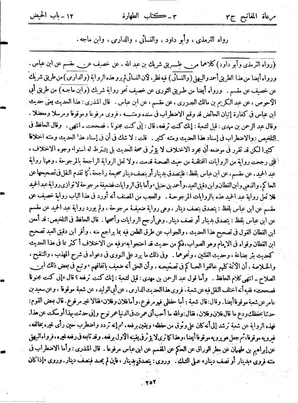 (رواه الترمذي وأبوداود) كلاهما من طريق شريك بن عبد الله، عن خصيف عن مقسم عن ابن عباس. ورواه أيضاً من هذا الطريق أحمد والبيهقي. (والنسائي) فيه نظر، لأن النسائي لم يرو هذه الرواية. (والدارمي) من طريق شريك عن خصيف عن مقسم. ورواه أيضاً من طريق الثوري عن خصيف نحو رواية شريك. (وابن ماجه) من طريق أبي الأحوص، عن عبد الكريم بن مالك الجزري، عن مقسم، عن ابن عباس. قال المنذرى: هذا الحديث يعني حديث ابن عباس في كفارة إتيان الحائض قد وقع الاضطراب في سنده ومتنه، فروى مرفوعاً موقوفاً ومرسلاً ومعضلاً. وقال عبد الرحمن بن مهدي: قيل لشعبة: إنك كنت ترفعه، قال: إني كنت مجنوناً، فصححت-انتهى. وقال الحافظ في التلخيص: والاضطراب في إسناد هذا الحديث ومتنه كثير. قلت: لاشك في أن في إسناد هذا الحديث ومتنه اختلافاً كثيراً لكن قد تقرر في موضعه أن مجرد الاختلاف لا يؤثر في صحة الحديث بل يشترط له استواء وجوه الاختلاف، فمتى رجحت رواية من الروايات المختلفة من حيث الصحة قدمت، ولا تعل الرواية الراجحة بالمرجوحة، وههنا رواية عبد الحميد، عن مقسم، عن ابن عباس بلفظ: فليتصدق بدينار أو بنصف دينار صحيحة راجحة، كما تقدم النقل في تصحيحها عن الحاكم، والذهبي وابن القطان وابن دقيق العيد، وأحمد بن حنبل، وأما باقي الروايات فضعيفة مرجوحة لا توازي رواية عبد الحميد فلا تعل رواية عبد الحميد هذه بالروايات المرجوحة. والعجب من المصنف أنه أورد هذا الباب رواية خصيف عن مقسم عن ابن عباس بلفظ: يتصدق بنصف دينار، وهي رواية ضعيفة مرجوحة، ولم يورد رواية عبد الحميد عن مقسم عن ابن عباس بلفظ: يتصدق بدينار أونصف دينار، وهي أرجح الروايات وأصحها. قال الحافظ في التلخيص: قد أمعن ابن القطان القول في تصحيح هذا الحديث، والجواب عن طريق الطعن فيه بما يراجع منه، وأقر ابن دقيق العيد تصحيح ابن القطان وقواه في الإمام وهو الصواب، فكم من حديث قد احتجوا به، وفيه من الاختلاف أكثر مما في هذا الحديث كحديث بئر بضاعة، وحديث القلتين، ونحوهما. وفي ذلك ما يرد على النووي في دعواه في شرح المهذب، والتنقيح، والخلاصة، أن الأئمة كلهم خالفوا الحاكم في تصحيحه، وأن الحق أنه ضعيف باتفاقهم، وتبع في بعض ذلك ابن الصلاح-انتهى كلام الحافظ. وأما قول عبد الرحمن بن مهدي: قيل لشعبة: إنك كنت ترفعه؟ قال: "إني كنت مجنوناً فصححت" ففيه أنه اختلف النقل فيه عن شعبة، فروى هذا الحديث الدارمي، عن أبي الوليد، عن شعبة موقوفاً، وعن سعيد بن عامر عن شعبة موقوفاً أيضاً. وقال: قال شعبة: أما حفظي فهو مرفوع، وأما فلان وفلان، فقالا غير مرفوع. قال بعض القوم: حدثنا بحفظك ودع ماقال فلان وفلان، فقال: والله ما أحب أني عمرت في الدنيا عمر نوح وإني حدثت بهذا أو سكت عن هذا. فهذه الرواية عن شعبة ترشد إلى أنه كان على وثوق من حفظه، ويقين برفعة، ثم إنه تردد واضطرب حين رأى غيره يخالفه، فيرويه موقوفاً، ثم جعل هو يرويه موقوفاً أيضا، وهذا كما ترى لا يؤثر في يقينه الأول برفعة. وقد تابعه في رفعه غيره، فرواه البيهقي عن إبراهيم بن طهمان عن مطر الوراق عن الحكم عن المقسم عن ابن عباس مرفوعاً. قال المنذري: وأما الاضطراب في متنه فروى"بدينار أو نصف دينار"على الشك. وروى: يتصدق بدينار، فإن لم يجد فنصف دينار. وروى "إذا كان