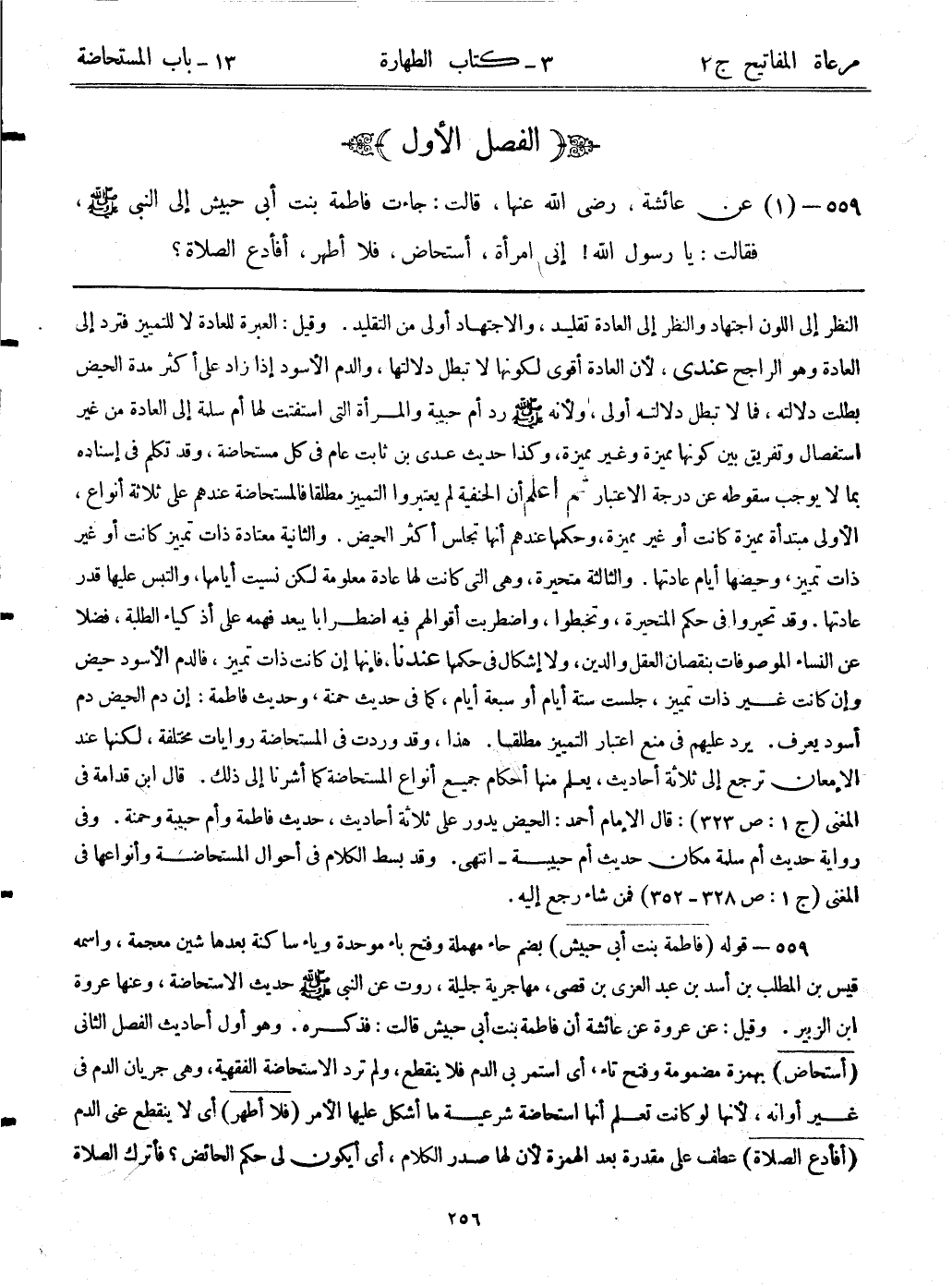 559- (1) عن عائشة، رضي الله عنها، قالت: ((جاءت فاطمة بنت أبي حبيش إلى النبي - صلى الله عليه وسلم -، فقالت: يا رسول الله! إني امرأة، أستحاض، فلا أطهر، أفأدع الصلاة؟