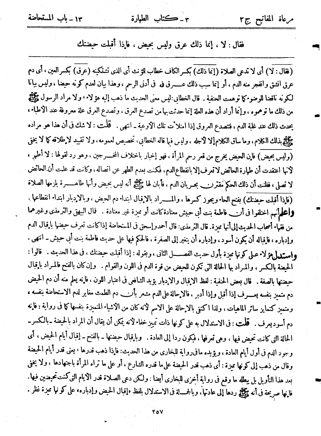 (فقال: لا) أي: لا تدع الصلاة (إنما ذلك) بكسر الكاف خطاب للمؤنث أي: الذي تشتكينه (عرق) بكسر العين، أي: دم عرق انشق وانفجر منه الدم، أو إنما سبب ذلك عرق في أدنى الرحم، وهذا بيان لعدم كونه حيضا، وليس بياناً لكونه ناقضاً للوضوء كما توهمت الحنفية. قال الخطابي: ليس معنى الحدث ما ذهب إليه هؤلاء، ولا مراد الرسول - صلى الله عليه وسلم - من ذلك ما توهموه، وإنما أراد أن هذه العلة إنما حدثت بها من تصدع العرق، وتصدع العرق علة معروفة عند الأطباء، يحدث ذلك عند غلبة الدم، فتتصدع العروق إذا امتلأت تلك الأوعية- انتهى. قلت: لا شك في أن هذا هو مراده - صلى الله عليه وسلم - بذلك الكلام، وما ساق الكلام إلا لأجله، وليس فيما قاله الخطابي، تخصيص لعمومه، ولا تقييد لإطلاقه كما لا يخفى (وليس بحيض) فإن الحيض يخرج من قعر رحم المرأة، فهو إخبار باختلاف المخرجين، وهو رد لقولها: لا أطهر، لأنها اعتقدت أن طهارة الحائض لا تعرف إلا بانقطاع الدم، فكنت بعدم الطهر عن اتصاله، وكانت قد علمت أن الحائض لا تصلي، فظننت أن ذلك الحكم مقترن بجريان الدم، فأبان لها - صلى الله عليه وسلم - أنه ليس بحيض وأنها طاهرة يلزمها الصلاة (فإذا أقبلت حيضتك) بفتح الحاء ويجوز كسرها، والمراد بالإقبال ابتداء دم الحيض، وبالإدبار ابتداء انقطاعها. واعلم أنهم اختلفوا في أن فاطمة بنت أبي حبيش معتادة كانت أو مميزة غير معتادة. فمال البيهقي والترمذي وغيرهما من فقهاء أصحاب الحديث إلى أنها مميزة. قال الترمذي: قال أحمد وإسحق في المستحاضة إذا كانت تعرف حيضها بإقبال الدم وإدباره، فإقباله أن يكون أسود، وإدباره أن يتغير إلى الصفرة، فالحكم فيها على حديث فاطمة بنت أبي حبيش- انتهى. واستدل هؤلاء على كونها مميزة بأول حديث الفصل الثاني، وبقوله: إذا أقبلت حيضتك، في هذا الحديث. قالوا: الحيضة بالكسر، والمراد بها الحالة التي تكون للحيض من قوة الدم في اللون والقوام. وإن كان بالفتح فالمراد بإقبال حيضتها بالصفة. قال بعض الحنفية: لفظ الإقبال والإدبار يؤيد الشافعي في اعتبار اللون، فإنه يعلم منه أن دم الحيض دم متميز بنفسه يعرف إذا أقبل وإذا أدبر، فالإحالة على الدم مشعر بأن دم الطمث مغاير لدم الإستحاضة بنفسه، ومتميز كتمايز سائر الماهيات، ولذا اكتفى بالإحالة على الإسم لأنه كان من الأشياء المتميزة بنفسها كما في رواية: فإنه دم أسود يعرف. قلت: في الاستدلال به على كونها ذات تمييز خفاء لأنه يمكن أن يقال: أن المراد بالحيضة- بالكسر- الحالة التي كانت تحيض فيها، وهي تعرفها، فيكون ردا إلى العادة. وبإقبال حيضتها– بالفتح – إقبال أيام الحيض، أي: وجود الدم في أول أيام العادة، ويؤيده ما في رواية للبخاري من هذا الحديث: فإذا ذهب قدرها، يعني قدر أيم الحيضة وقال من ذهب إلى كونها مميزة: أي: ذهب قدر الحيضة على ما قدره الشارع، أو على ما تراه المرأة باجتهادها، ولا يخفى بعد هذا التأويل بل يبطله ما وقع في رواية أخرى للبخاري أيضاً: ولكن دعي الصلاة قدر الأيام التي كنت تحيضين فيها. فإنها صريحة في أنه - صلى الله عليه وسلم - ردها إلى عادتها، وبالجملة في الاستدلال بلفظ"إقبال الحيض وإدباره"على كونها مميزة نظر.