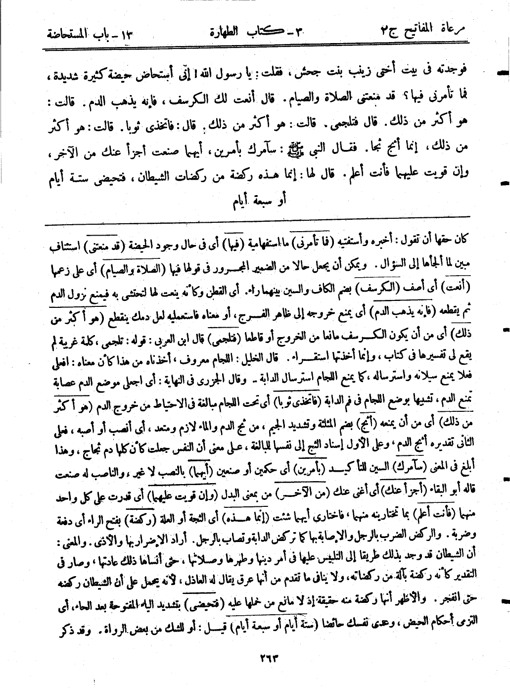 كان حقها أن تقول: أخبره وأستفتيه (فما تأمرني) ما استفهامية (فيها) أي: في حال وجود الحيضة (قد منعتني) استئناف مبين لما ألجأها إلى السؤال. ويمكن أن يجعل حالاً من الضمير المجرور في قولها فيها (الصلاة والصيام) أي: على زعمها (أنعت) أي: أصف (الكرسف) بضم الكاف والسين بينهما راء. أي: القطن وكأنه ينعت لها لتحتشى به فيمنع نزول الدم ثم يقطعه (فإنه يذهب الدم) أي: يمنع خروجه إلى ظاهر الفرج، أو معناه فاستعمليه لعل دمك ينقطع (هو أكثر من ذلك) أي: من أن يكون الكرسف مانعا من الخروج أو قاطعاً (فتلجمى) قال ابن العربي: قوله: تلجمى، كلمة غريبة لم يقع لي تفسيرها في كتاب، وإنما أخذتها استقراء. قال الخليل: اللجام معروف، أخذناه من هذا كأن معناه: افعلي فعلا يمنع سيلانه واسترساله، كما يمنع اللجام استرسال الدابة. وقال الجزري في النهائية: أي: اجعلي موضع الدم عصابة تمنع الدم، تشبيها بوضع اللجام في فم الدابة (فاتخذي ثوبًا) أي: تحت اللجام مبالغة في الاحتياط من خروج الدم (هو أكثر من ذلك) أي: من أن يمنعه (أثج) بضم المثلثة وتشديد الجيم، من ثج الدم والماء لازم ومتعد، أي: أنصب أو أصبه، فعلى الثاني تقديره أثج الدم، وعلى الأول إسناد الثج إلى نفسها للمبالغة، على معنى أن النفس جعلت كأن كلها دم ثجاج، وهذا أبلغ في المعنى (سآمرك) السين للتأكيد (بأمرين) أي: حكمين أو صنعين (أيهما) بالنصب لا غير، والناصب له صنعت قاله أبوالبقاء (أجرأ عنك) أي: أغنى عنك (من الآخر) من بمعنى البدل (وإن قويت عليهما) أي: قدرت على كل واحد منهما (فأنت أعلم) بما تختارينه منهما، فاختاري أيهما شئت (إنما هذه) أي: الثجة أو العلة (ركضة) بفتح الراء أي: دفعة وضربة. والركض الضرب بالرجل والإصابة بها كما تركض الدابة وتصاب بالرجل. أراد الإضرار بها والأذى. والمعنى: أن الشيطان قد وجد بذلك طريقاً إلى التلبيس عليها في أمر دينها وطهرها وصلاتها، حتى أنساها ذلك عادتها، وصار في التقدير كأنه ركضة بآلة من ركضاته، ولا ينافي ما تقدم من أنها عرق يقال: له العاذل، لأنه يحمل على أن الشيطان ركضه حتى انفجر. والأظهر أنها ركضة منه حقيقة إذا لا مانع من حملها عليه (فتحيضي) بتشديد الياء المفتوحة بعد الحاء، أي: التزمي أحكام الحيض، وعدي نفسك حائضا (ستة أيام أو سبعة أيام) قيل: أو للشك من بعض الرواة. وقد ذكر