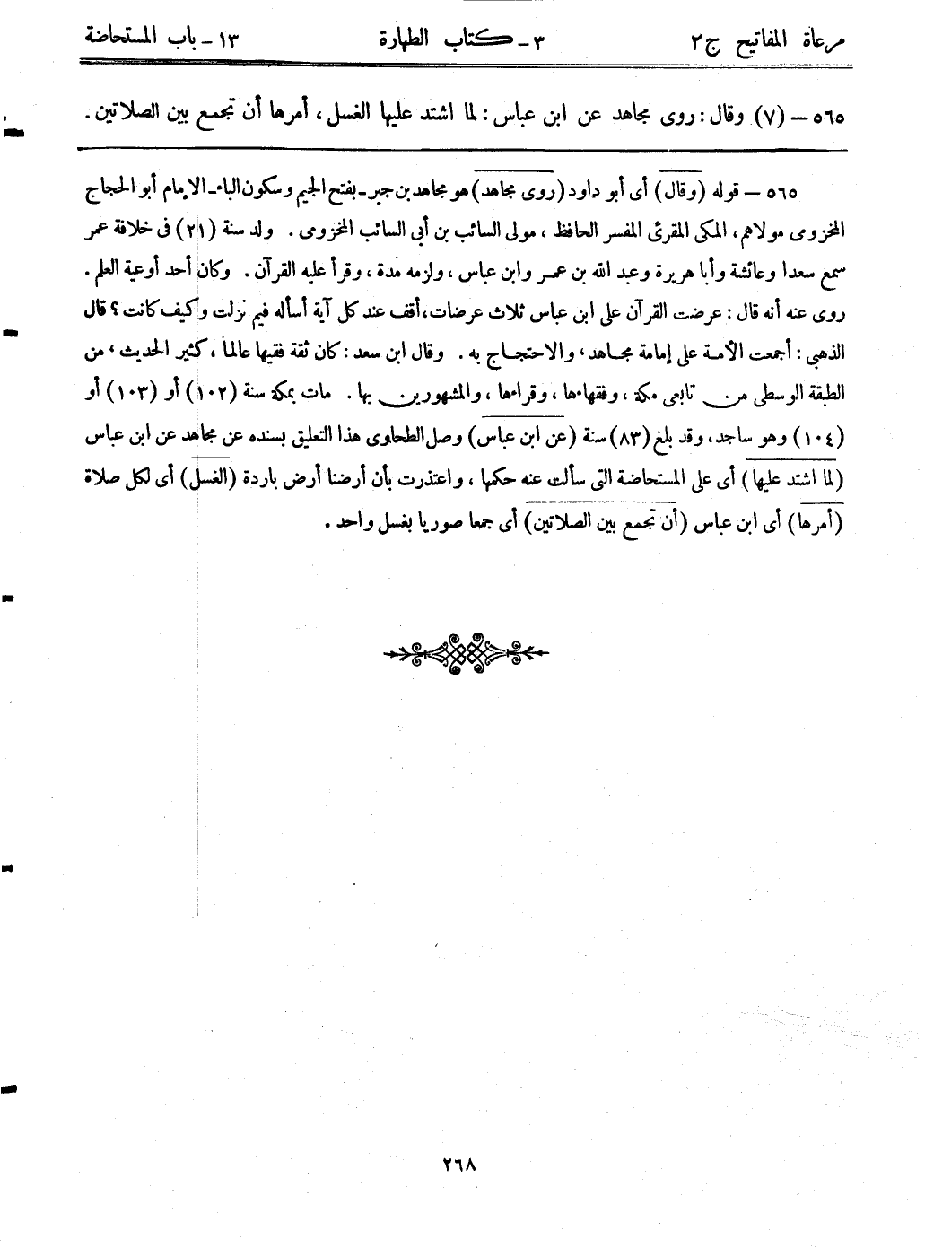 565- قوله: (وقال) أي: أبوداود (روى مجاهد) هو مجاهد بن جبر – بفتح الجيم وسكون الباء- الإمام أبوالحجاج المخزومي مولاهم، المكي المقرئ المفسر الحافظ، مولى السائب بن أبي السائب المخزومي. ولد سنة (21) في خلافة عمر سمع سعداً وعائشة وأبا هريرة وعبد الله بن عمر وابن عباس، ولزمه مدة، وقرأ عليه القرآن. وكان أحد أوعية العلم. روى عنه أنه قال: عرضت القرآن على ابن عباس ثلاث عرضات، أقف عند كل آية أسأله فيم نزلت وكيف كانت؟ قال الذهبي: أجمعت الأمة على إمامة مجاهد، والاحتجاج به. وقال ابن سعد: كان ثقةً فقيهاً عالماً، كثير الحديث، من الطبقة الوسطى من تابعي مكة، وفقهاءها، وقراءها، والمشهورين بها. مات بمكة سنة (102) أو (103) أو (104) وهو ساجد، وقد بلغ (83) سنة (عن ابن عباس) وصل الطحاوى هذا التعليق بسنده عن مجاهد عن ابن عباس (لما اشتد عليها) أي: على المستحاضة التي سألت عنه حكمها، واعتذرت بأن أرضنا أرض باردة (الغسل) أي: لكل صلاة (أمرها) أي: ابن عباس (أن تجمع بين الصلاتين) أي: جمعاً صورياً بغسل واحد.