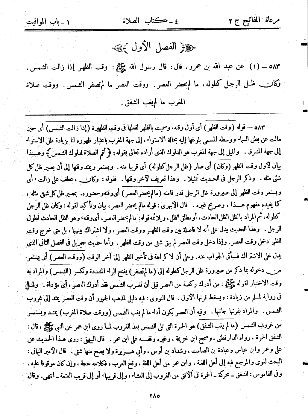583- (1) عن عبد الله بن عمرو، قال: قال رسول الله - صلى الله عليه وسلم -: ((وقت الظهر إذا زالت الشمس، وكان ظل الرجل كطوله، ما لم يحضر العصر. ووقت العصر ما لم تصفر الشمس. ووقت صلاة المغرب ما لم يغب الشفق.