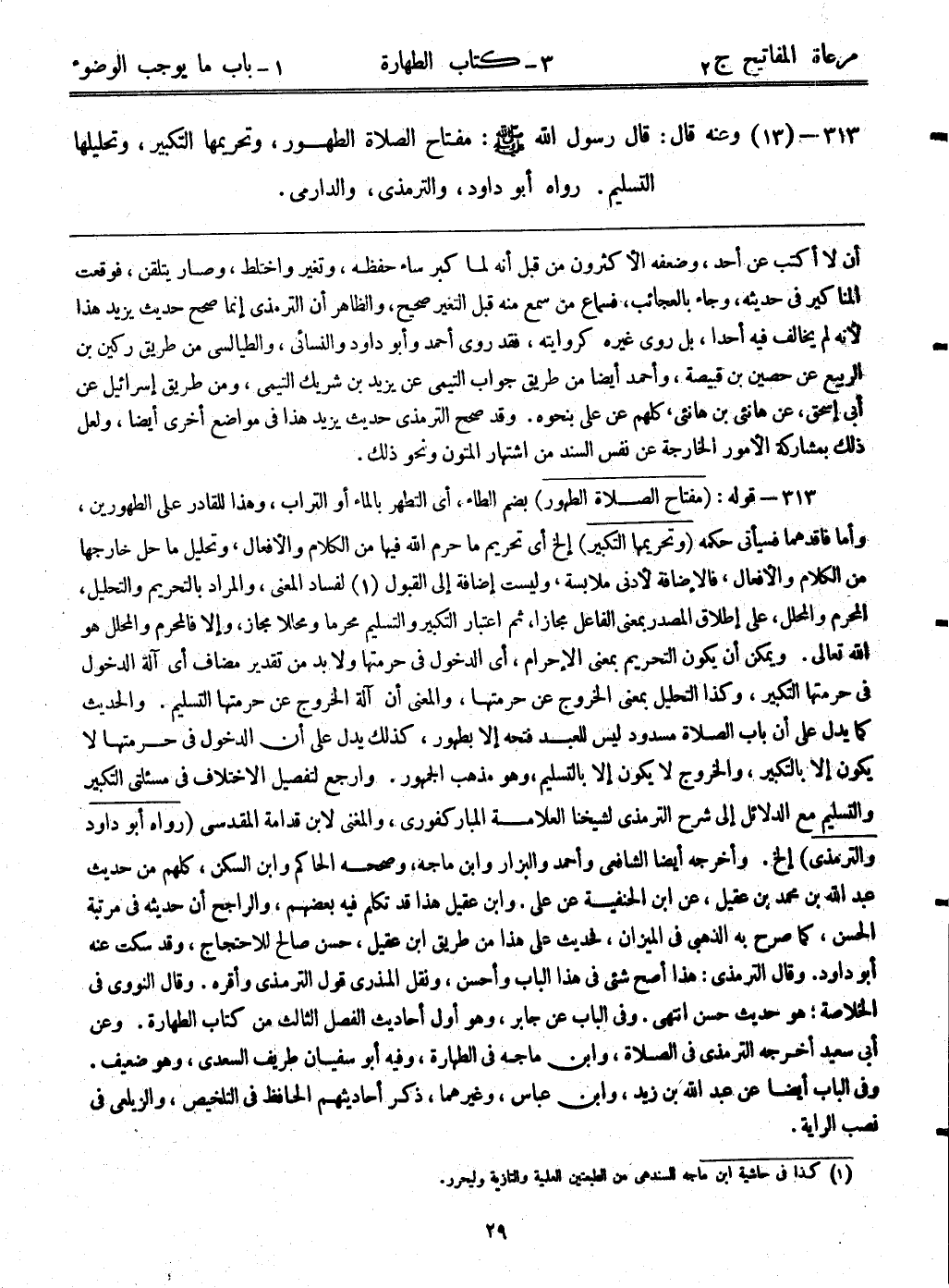 313- (13) وعنه قال: قال رسول الله - صلى الله عليه وسلم -: ((مفتاح الصلاة الطهور، وتحريمها التكبير، وتحليلها التسليم)) رواه أبوداود، والترمذي، والدارمي.