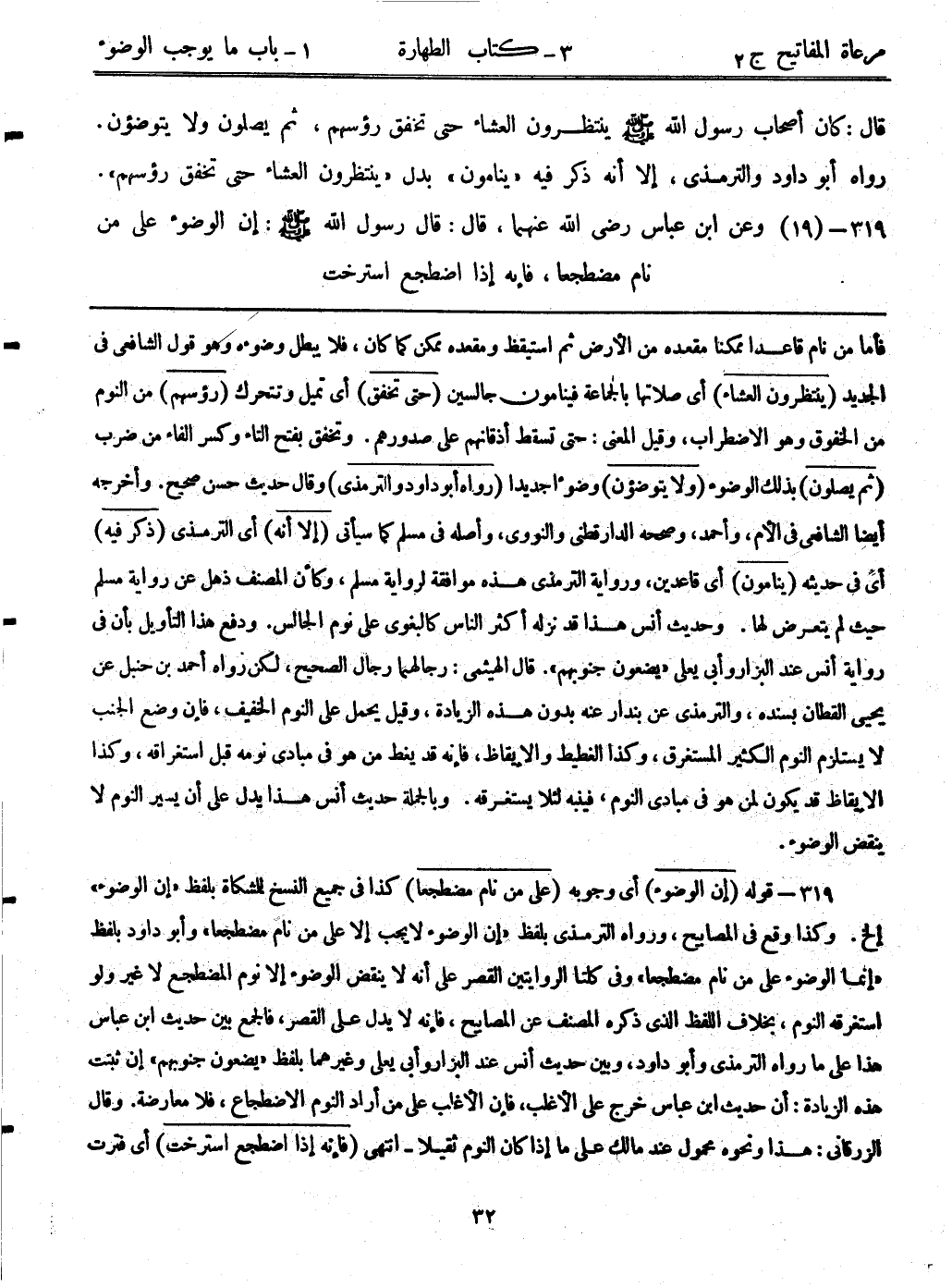 319- قوله: (إن الوضوء) أي وجوبه. (على من نام مضطجعاً) كذا في جميع النسخ للمشكاة بلفظ "إن الوضوء" الخ. وكذا وقع في المصابيح، ورواه الترمذي بلفظ "إن الوضوء لا يجب إلا على من نام مضطجعاً"، وأبوداود بلفظ "إنما الوضوء على من نام مضطجعاً"، وفي كلتا الروايتين القصر على أنه لا ينقض الوضوء إلا نوم المضطجع لا غير ولو إستغرقه النوم، بخلاف اللفظ الذي ذكره المصنف عن المصابيح، فإنه لا يدل على القصر، فالجمع بين حديث ابن عباس هذا على ما رواه الترمذي وأبوداود، وبين حديث أنس عند البزار وأبي يعلى وغيرهما بلفظ "يضعون جنوبهم" إن ثبتت هذه الزيادة: أن حديث ابن عباس خرج على الأغلب، فإن الأغلب على من أراد النوم الاضطجاع، فلا معارضة. وقال. الزرقاني: هذا ونحوه محمول عند مالك على ما إذا كان النوم ثقيلاً-انتهى. (فإنه إذا اضطجع استرخت) أي فترت
