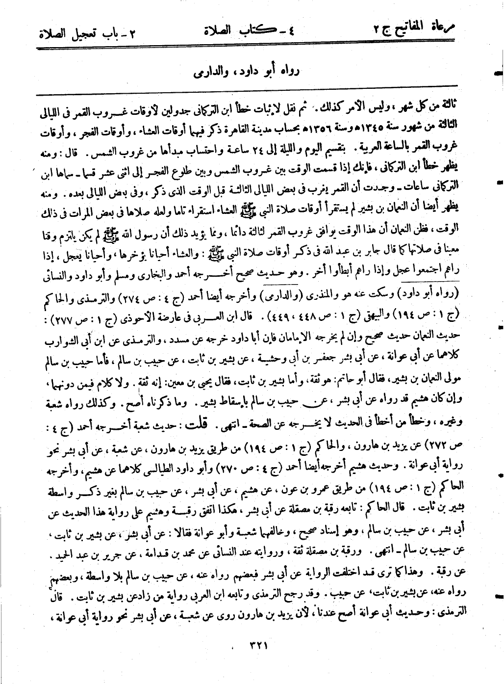 ثالثة من كل شهر، وليس الأمر كذلك. ثم نقل لإثبات خطأ ابن التركماني جدولين لأوقات غروب القمر في الليالي الثالثة من شهور سنة 1345هـ. وسنة 1356هـ. بحساب مدينة القاهرة ذكر فيهما أوقات العشاء، وأوقات الفجر، وأوقات غروب القمر بالساعة العربية. بتقسيم اليوم والليلة إلى 24 ساعة واحتساب مبدأها من غروب الشمس. قال: ومنه يظهر خطأ ابن التركماني، فإنك إذا قسمت الوقت بين غروب الشمس وبين طلوع الفجر إلى اثنى عشر قسماً – سماها ابن التركماني ساعات – وجدت أن القمر يغرب في بعض الليالي الثالثة قبل الوقت الذي ذكر، وفي بعض الليالي بعده. ومنه يظهر أيضاً أن النعمان بن بشير لم يستقرأ أوقات صلاة النبي - صلى الله عليه وسلم - العشاء استقراء تاماً، ولعله صلاها في بعض المرات في ذلك الوقت، فظن النعمان أن هذا الوقت يوافق غروب القمر لثالثة دائماً، ومما يؤيد ذلك أن رسول الله - صلى الله عليه وسلم - لم يكن يلتزم وقتاً معيناً في صلاتها، كما قال جابر بن عبد الله في ذكر أوقات صلاة النبي - صلى الله عليه وسلم -: والعشاء أحياناً يؤخرها، وأحياناً يعجل، إذا رآهم اجتمعوا عجل، وإذا رآهم أبطأوا أخر. وهو حديث صحيح أخرجه أحمد والبخاري ومسلم وأبوداود والنسائي. (رواه أبوداود) وسكت عنه هو والمنذري. (والدارمي) وأخرجه أيضاً أحمد (ج4: ص274) والترمذي والحاكم (ج1: ص194) والبيهقي (ج1: ص448، 449) . قال ابن العربي في عارضة الأحوذى (ج1: ص277) : حديث النعمان حديث صحيح وإن لم يخرجه الإمامان فإن أباداود خرجه عن مسدد، والترمذي عن ابن أبي الشوارب كلاهما عن أبي عوانة، عن أبي بشر جعفر بن أبي وحشية، عن بشير بن ثابت، عن حبيب بن سالم، فأما حبيب بن سالم مولى النعمان بن بشير، فقال أبوحاتم: هو ثقة، وأما بشير بن ثابت، فقال: يحيى بن معين: إنه ثقة. ولا كلام فيمن دونهما، وإن كان هشيم قد رواه عن أبي بشر، عن حبيب بن سالم بإسقاط بشير. وما ذكرناه أصح. وكذلك رواه شعبة وغيره، وخطأ من أخطأ في الحديث لا يخرجه عن الصحة – انتهى. قلت: حديث شعبة أخرجه أحمد (ج4: ص272) عن يزيد بن هارون، والحاكم (ج1: ص194) من طريق يزيد بن هارون، عن شعبة، عن أبي بشر نحو رواية أبي عوانة. وحديث هشيم أخرجه أيضاً أحمد (ج4: ص270) وأبوداود الطيالسي كلاهما عن هشيم، وأخرجه الحاكم (ج1: ص194) من طريق عمرو بن عون، عن هشيم، عن أبي بشر، عن حبيب بن سالم بغير ذكر واسطة بشير بن ثابت، قال الحاكم: تابعه رقبة مصقلة، عن أبي بشر، هكذا اتفق رقبة وهشيم على رواية هذا الحديث عن أبي بشر، عن حبيب بن سالم، وهو إسناد صحيح، وخالفهما شعبة وأبوعوانة فقالا: عن أبي بشر، عن بشير بن ثابت، عن حبيب بن سالم – انتهى. ورقبة بن مصقلة ثقة، وروايته عند النسائي عن محمد بن قدامة، عن جرير بن عبد الحميد. عن رقبة. وهذا كما ترى قد اختلفت الرواية عن أبي بشر، فبعضهم رواه عنه، عن حبيب بن سالم بلا واسطة، وبعضهم رواه عنه، عن بشير بن ثابت، عن حبيب. وقد رجح الترمذي وتابعه ابن العربي رواية من زاد عن بشير بن ثابت. قال الترمذي: وحديث أبي عوانة أصح عندنا؛ لأن يزيد بن هارون روى عن شعبة، عن أبي بشر نحو رواية أبي عوانة،