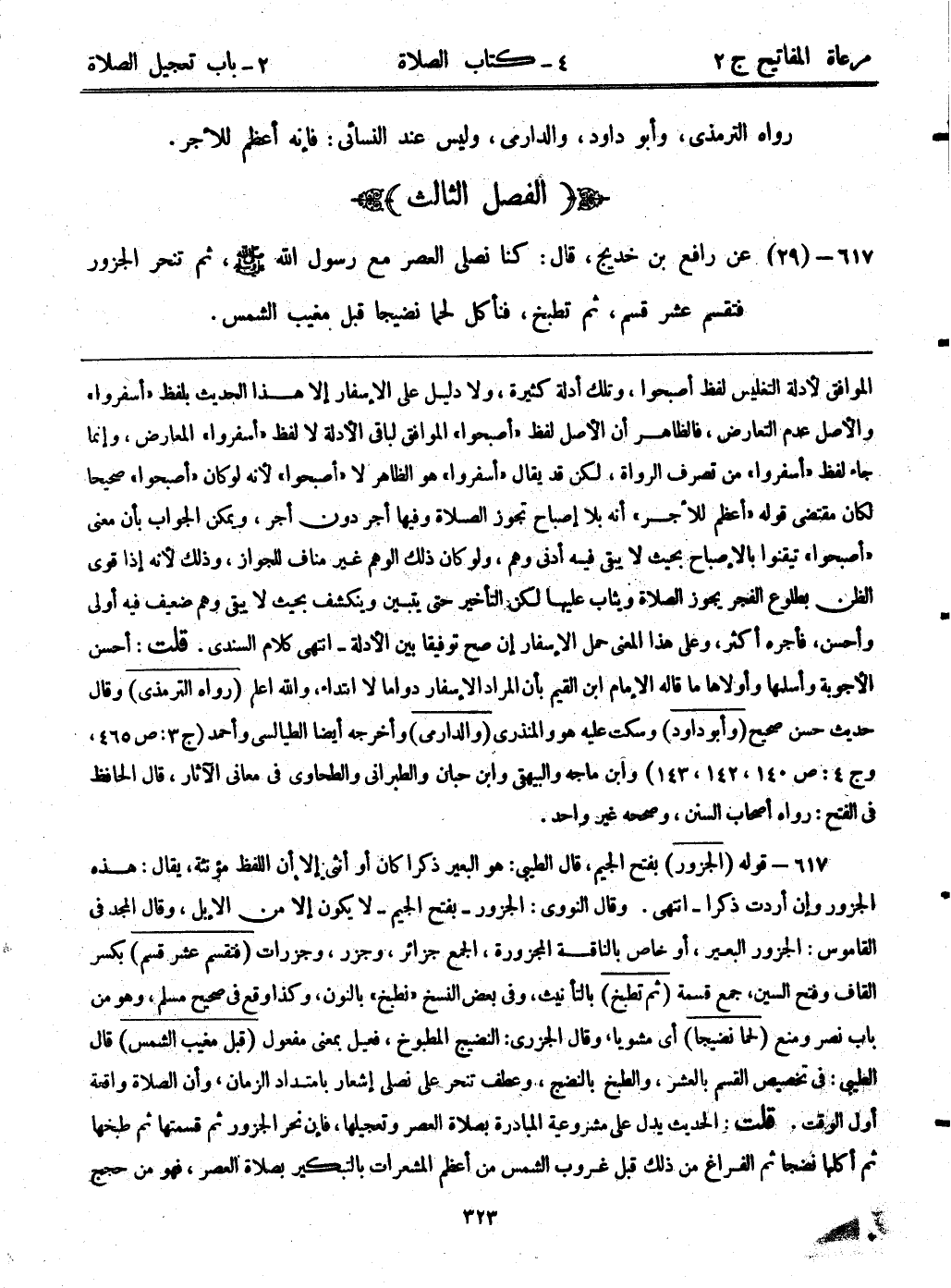 617- قوله: (الجزور) بفتح الجيم، قال الطيبي: هو البعير ذكراً كان أو أنثى إلا أن اللفظ مؤنثة، يقال: هذه الجزور وإن أردت ذكراً – انتهى. وقال النووي: الجزور-بفتح الجيم- لا يكون إلا من إلإبل، وقال المجد في القاموس: الجزور البعير، أو خاص بالناقة المجزورة، الجمع جزائر، وجزر، وجزرات. (فتقسم عشر قسم) بكسر القاف وفتح السين، جمع قسمة. (ثم تطبخ) بالتأنيث، وفي بعض النسخ "نطبخ" بالنون، وكذا وقع في صحيح مسلم، وهو من باب نصر ومنع. (لحماً نضيجاً) أي مشوياً، وقال الجزري: النضيج المطبوخ، فعيل بمعنى مفعول. (قبل مغيب الشمس) قال الطيبي: في تخصيص القسم بالعشر، والطبخ بالنضج، وعطف تنحر على نصلي إشعار بإمتداد الزمان، وأن الصلاة واقعة أول الوقت. قلت: الحديث يدل على مشروعية المبادرة بصلاة العصر وتعجيلها، فإن نحر الجزور ثم قسمتها ثم طبخها ثم أكلها نضجاً، ثم الفراغ من ذلك قبل غروب الشمس من أعظم المشعرات بالتبكير بصلاة العصر، فهو من حجيج