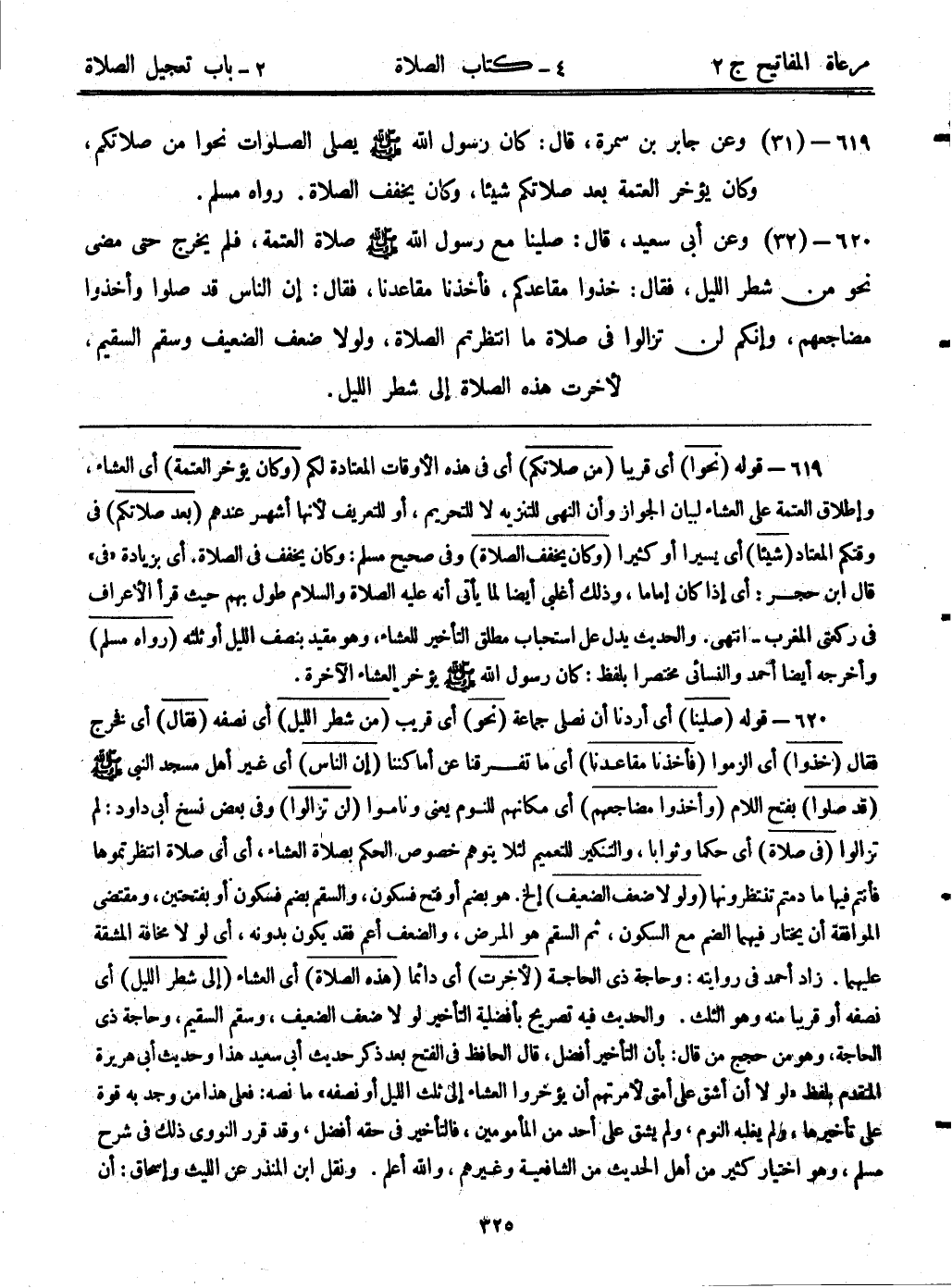 619- قوله: (نحواً) أي قريباً. (من صلاتكم) أي في هذه الأوقات المعتادة لكم. (وكان يؤخر العتمة) أي العشاء، وإطلاق العتمة على العشاء لبيان الجواز وأن النهي للتنزيه لا للتحريم، أو للتعريف؛ لأنها أشهر عندهم. (بعد صلاتكم) في وقتكم المعتاد. (شيئاً) أي يسيراً أو كثيراً. (وكان يخفف الصلاة) وفي صحيح مسلم: وكان يخفف في الصلاة. أي بزيادة "في" قال ابن حجر: أي إذا كان إماماً، وذلك أغلبي أيضاً لما يأتي أنه عليه الصلاة والسلام طول بهم حيث قرأ الأعراف في ركعتي المغرب-انتهى. والحديث يدل على استحباب مطلق التأخير للعشاء، وهو مقيد بنصف الليل أو ثلثه. (رواه مسلم) وأخرجه أيضاً أحمد والنسائي مختصراً بلفظ: كان رسول الله - صلى الله عليه وسلم - يؤخر العشاء الآخرة.